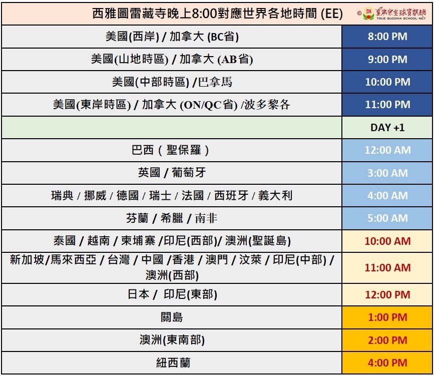 溫馨提醒:北美調時,西雅圖雷藏寺和彩虹雷藏寺同修法會世界對照........