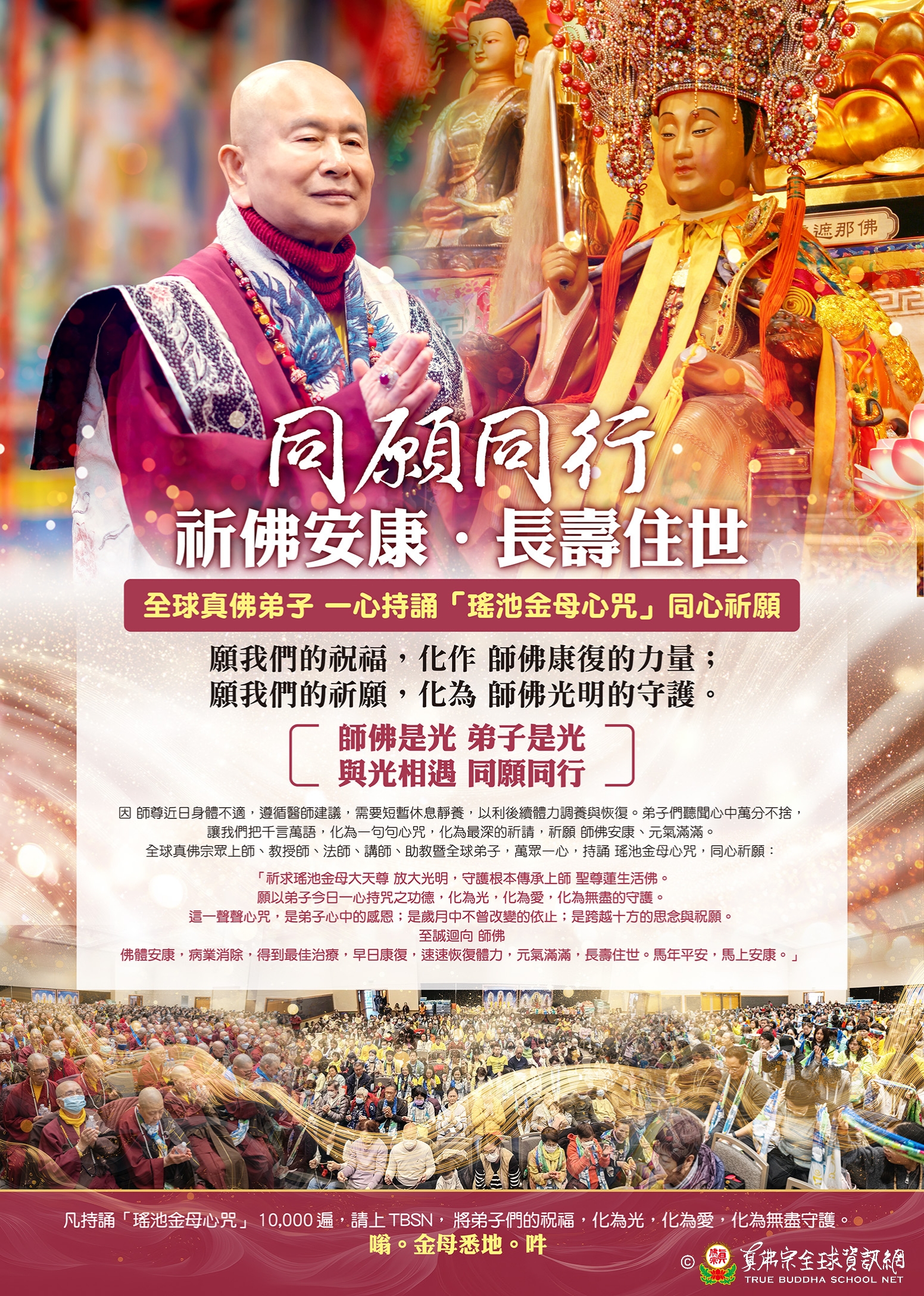 全球真佛宗眾上師、教授師、法師、講師、助教暨全球弟子,萬眾一心,持誦 瑤池金母心咒,同心祈願: