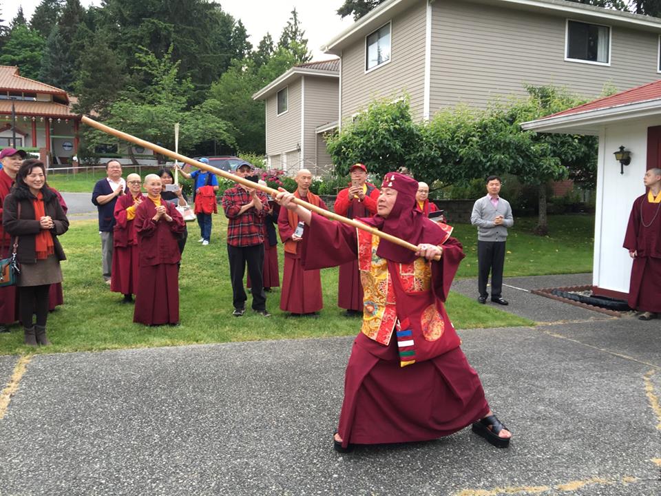久違了!! 師尊的「少林棍法」和「金剛拳」。今天的師尊興致盎然,再度威風凜凜的舞動起少林棍法,在呼喝聲中,師尊依舊熟練的棍花技巧,引起全場弟子的讚聲連連。師母也急忙到屋裡,拿出音響撥放武打的音樂,師尊接著又打起了金剛拳。看來,師尊要再度恢復往日雄風,絕對是指日可待的事。