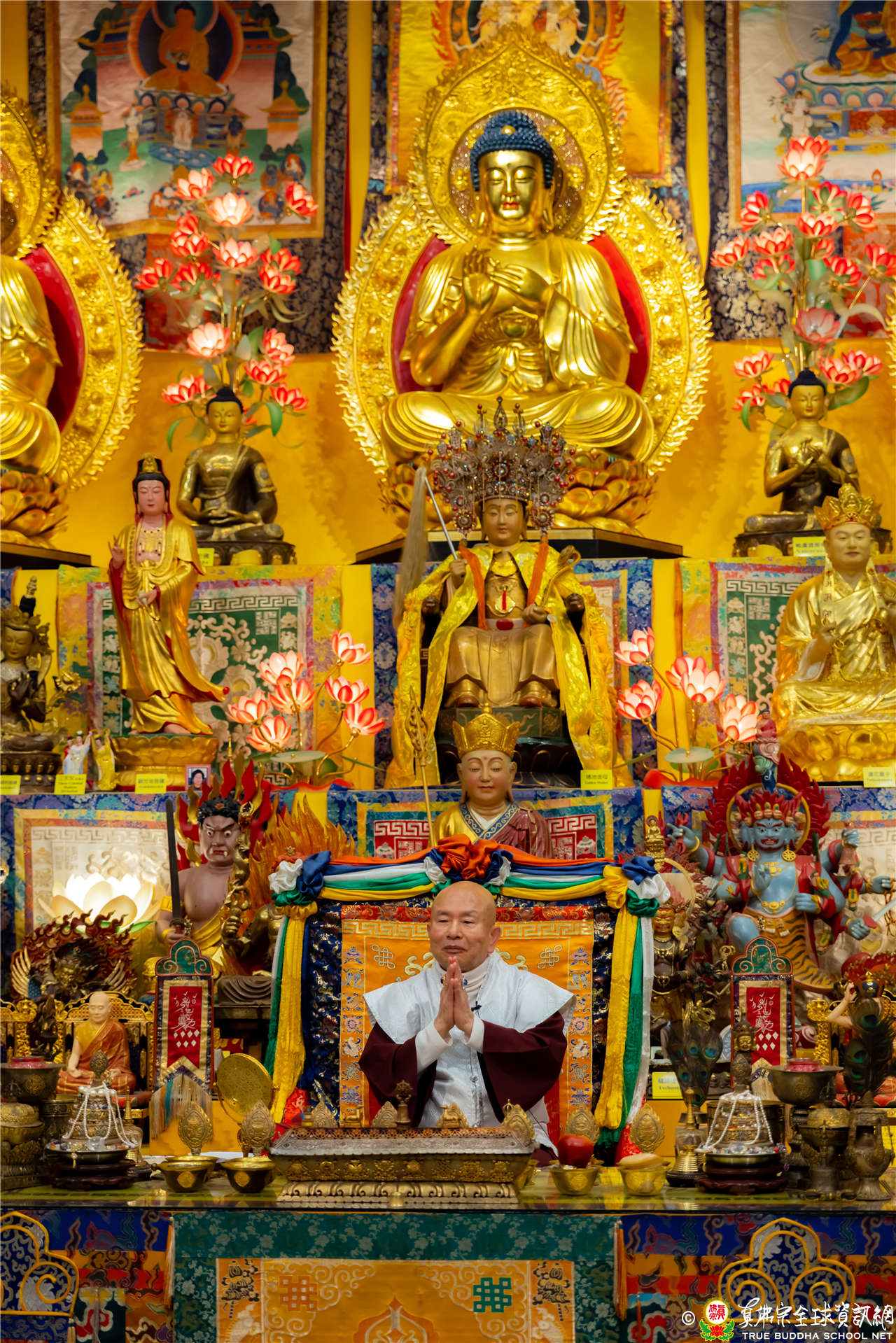 晚上八時許,在嘹亮的蓮花童子心咒樂聲中,聖尊蓮生活佛安詳徐步進入大雄寶殿,帶領大眾頂禮壇城諸佛菩薩護法金剛,並修持蓮花童子本尊法。同修後聖尊告訴大眾,蓮花童子,童子是代表清淨的意思,蓮花是出淤泥而不染,我們把自己清淨了,再教導別人清淨,這就是菩薩。