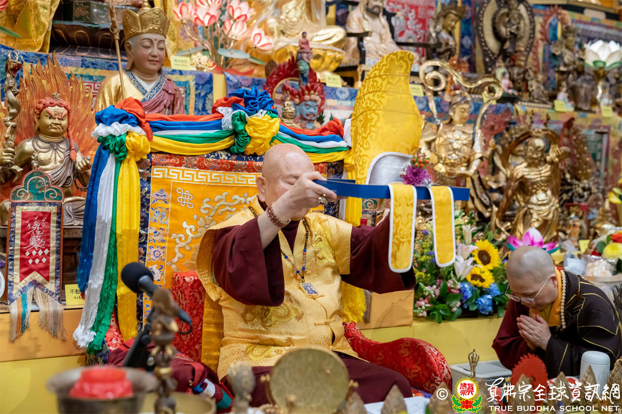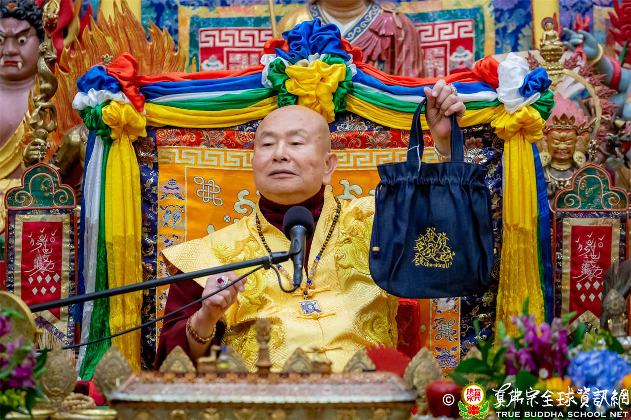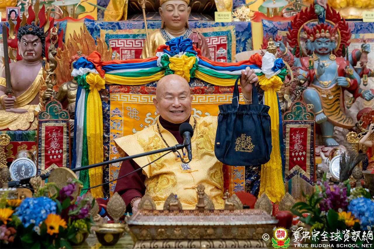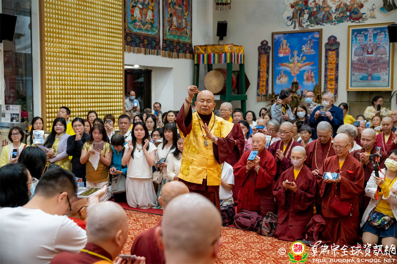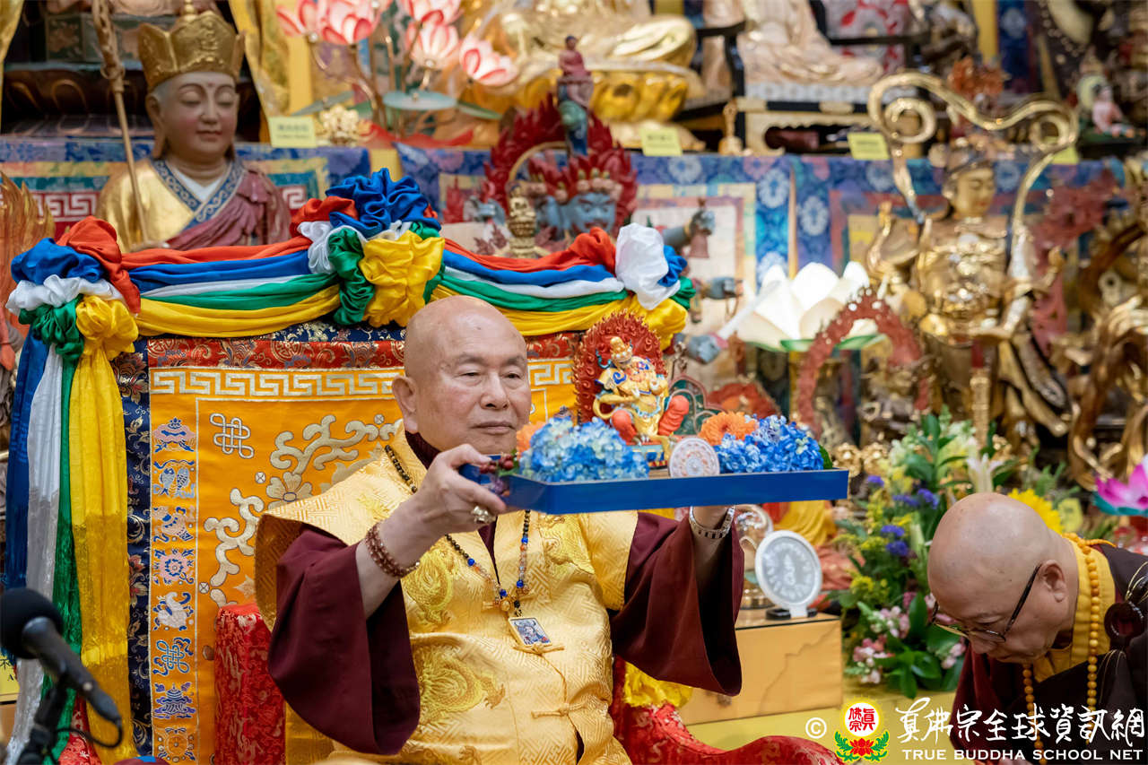 聖尊精闢寶貴的法語開示後,慈悲為新皈依弟子做皈依灌頂,然後加持大悲咒水,開光佛像,最後持拂塵一一加持與會大眾。