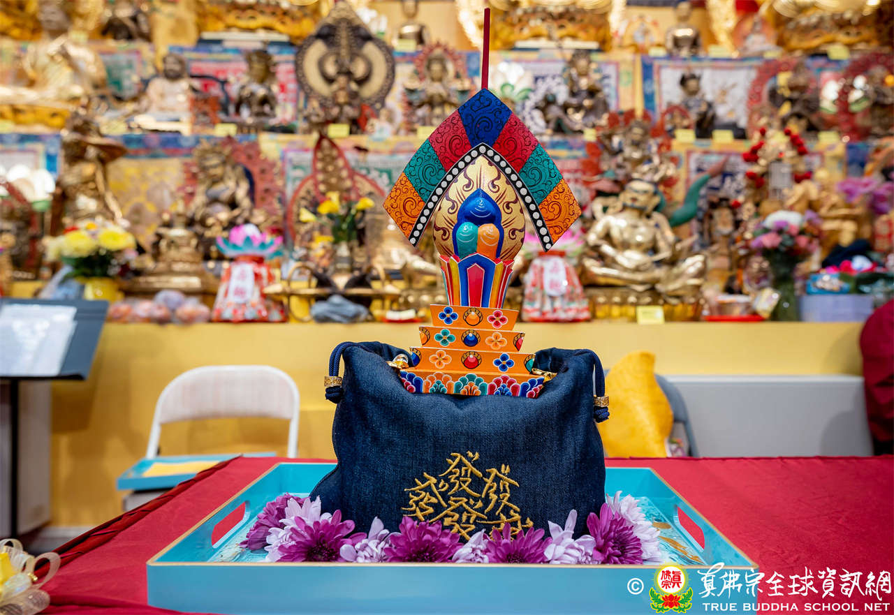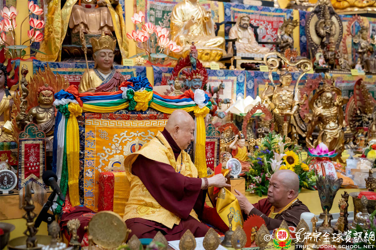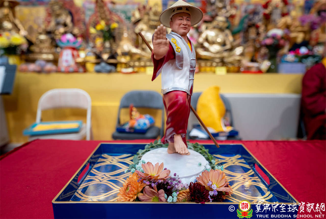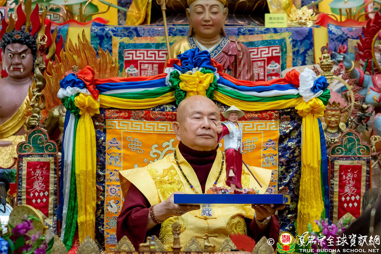 聖尊精闢寶貴的法語開示後,慈悲為新皈依弟子做皈依灌頂,然後加持大悲咒水,開光佛像,最後持拂塵一一加持與會大眾。