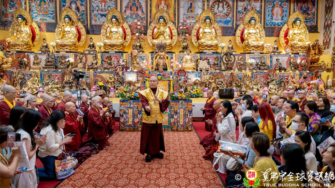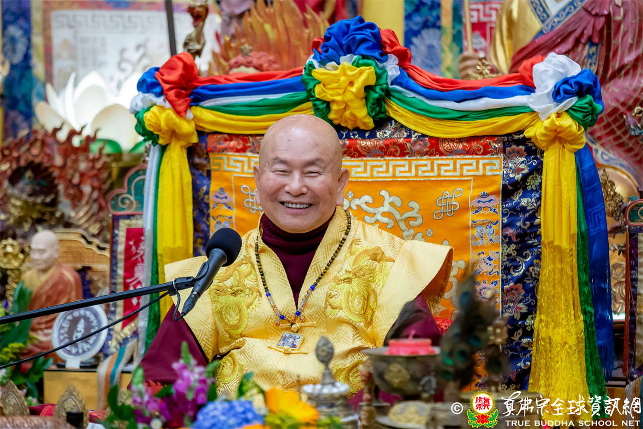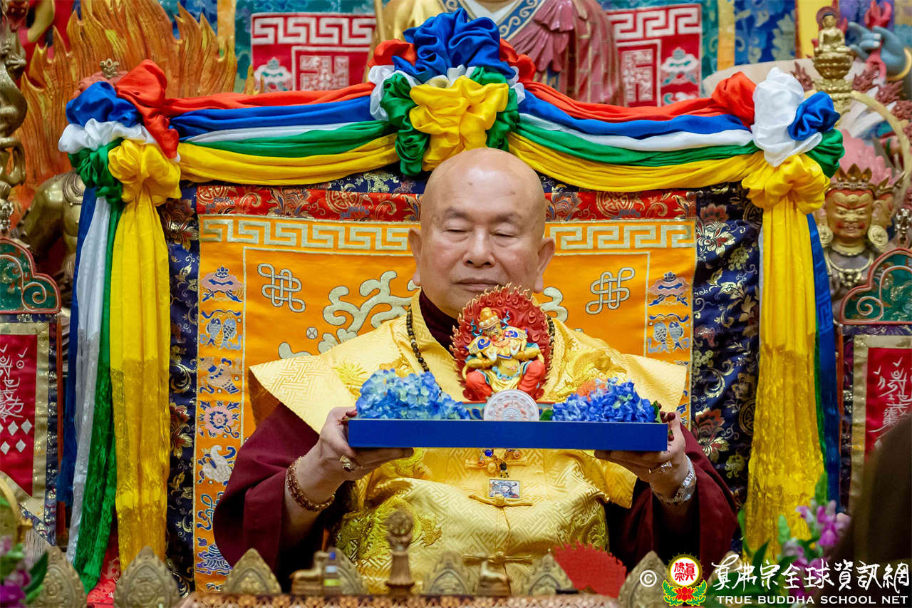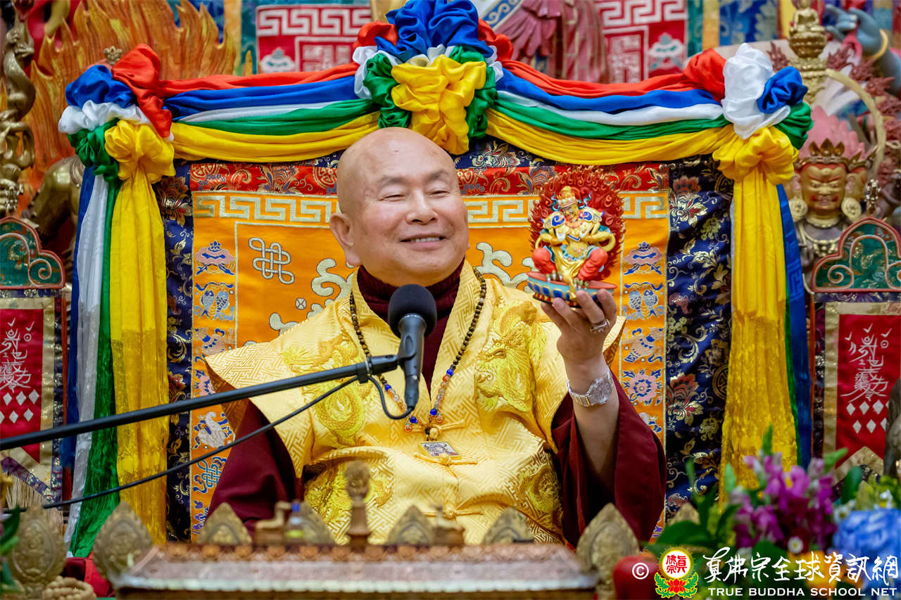 開示時,聖尊捧起扎基拉姆的金身,告訴大眾:這一尊坐姿的扎基拉姆,非常莊嚴,是西雅圖雷藏寺首創、獨有的,跟市面上所有的扎基拉姆不一樣,這尊扎基拉姆的主要顏色是黃色,祂放黃色的光,代表增益,這也是我們這一次法會的重點,要讓大家的資糧與願望得到滿足,讓大家能夠暴富。