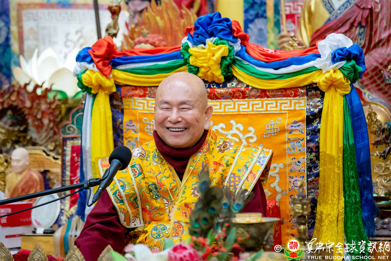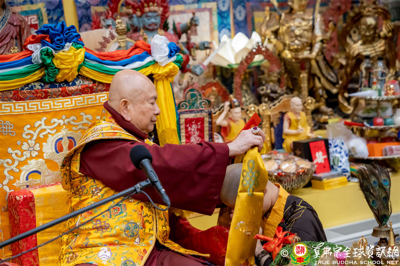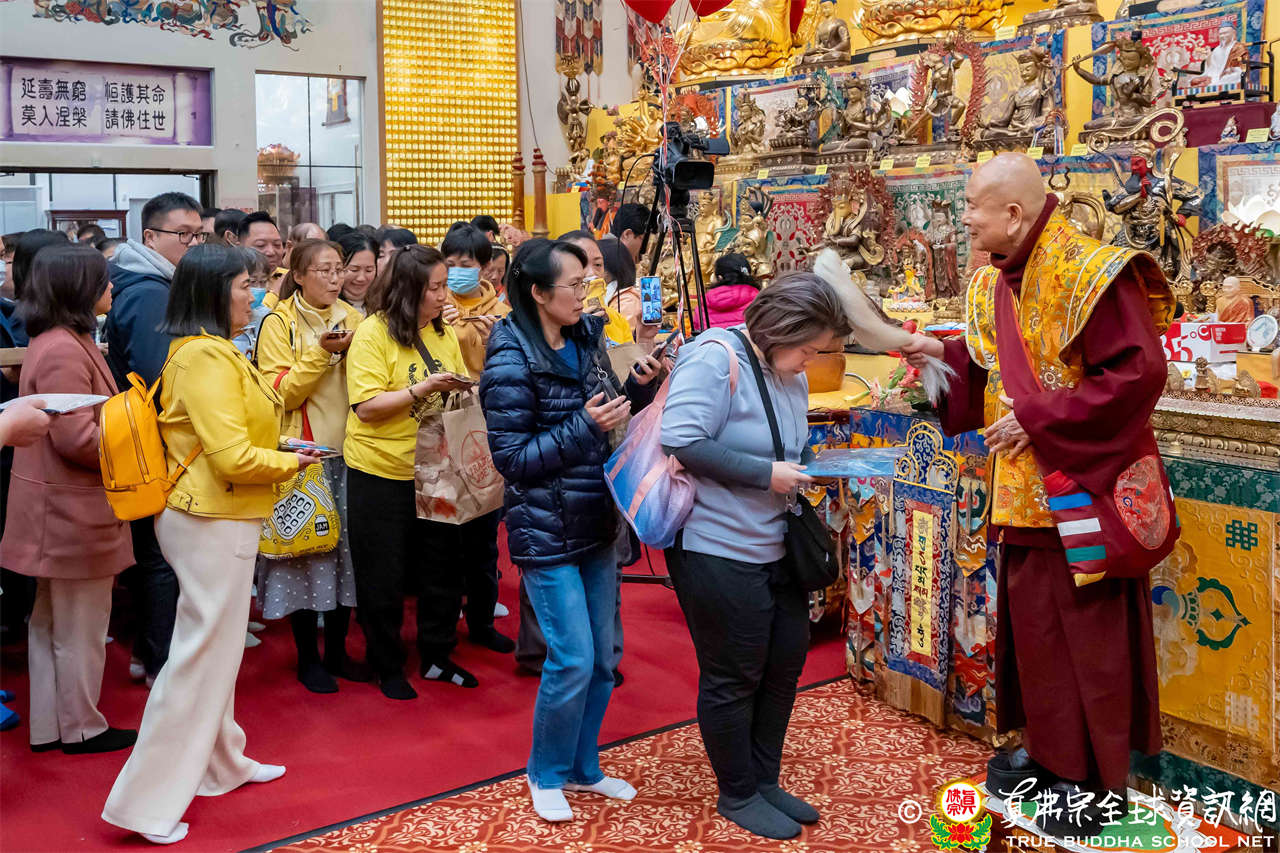 在殊勝珍貴的法語開示之後,聖尊為新皈依者進行皈依灌頂,並以拂塵加持與會大眾,法喜充滿。