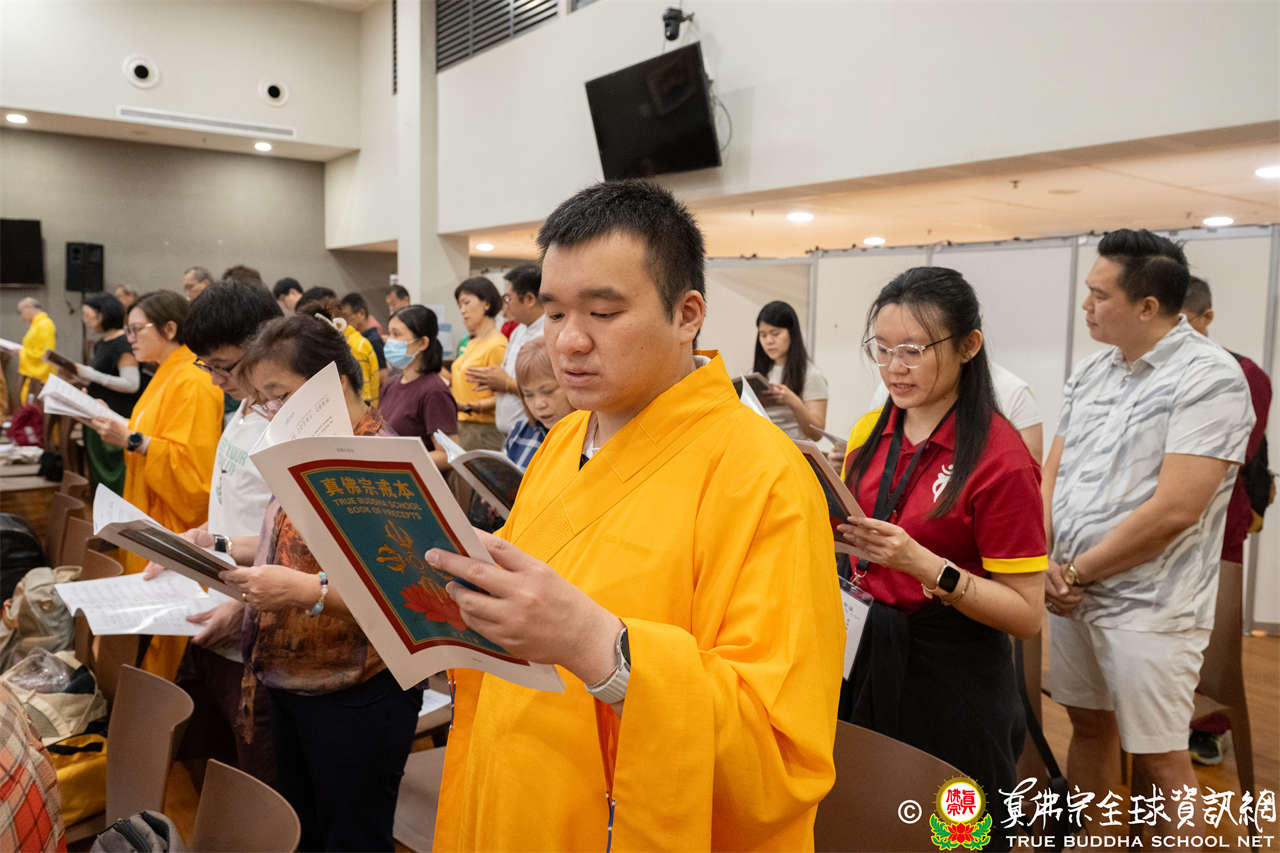 開幕禮後,新加坡首次舉辦集體誦戒儀式,恭請長老釋蓮滿上師與長老釋蓮傳上師帶領恭誦【在家菩薩戒】,受戒弟子著幔衣,居士同門列於後方,全場近有二百位真佛弟子共同誦戒,每一條戒文均採中文、英文雙語誦戒。誦戒完畢,恭請蓮滿長老以根本上師蓮生法王親自簽名加持的戒板,一一為戒子、同門加持,讓與會弟子在莊嚴儀式中獲得戒體的圓滿祝福,以及未來有機會得受菩薩戒。