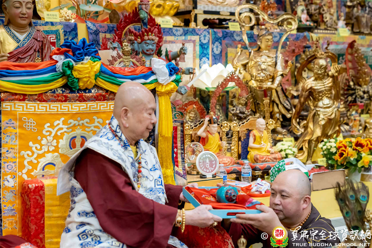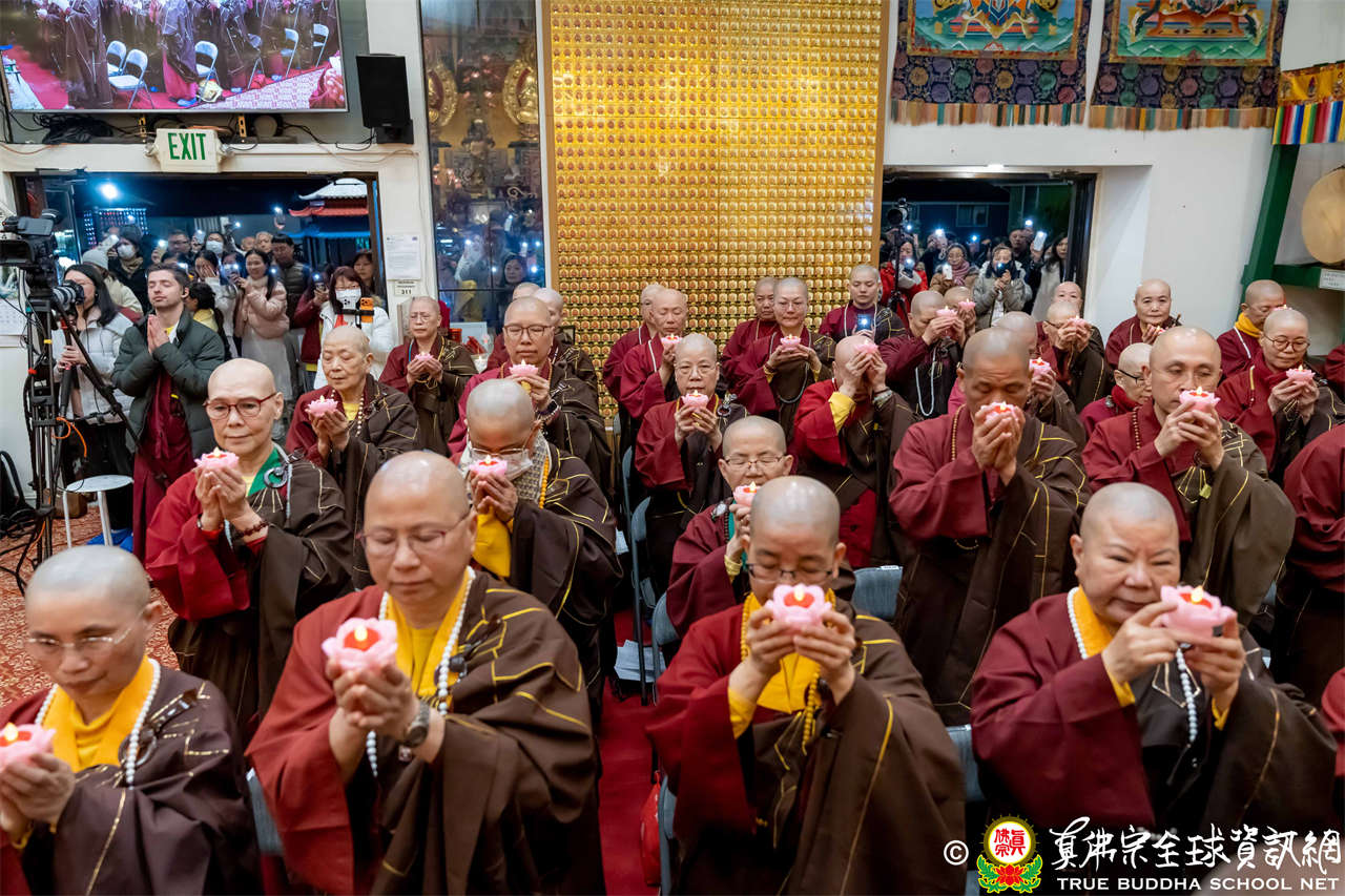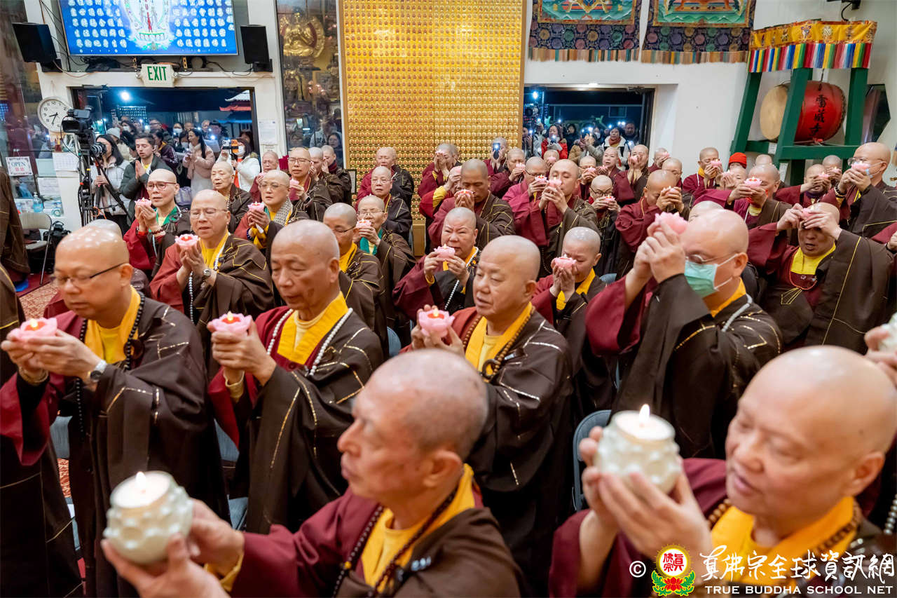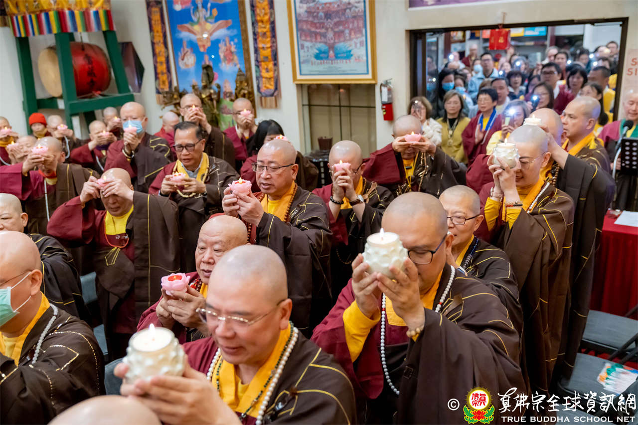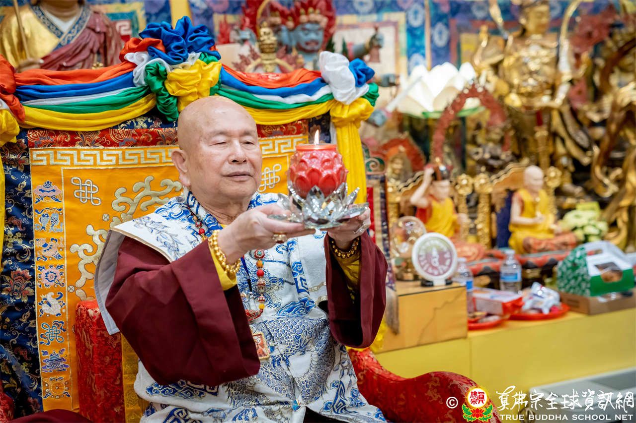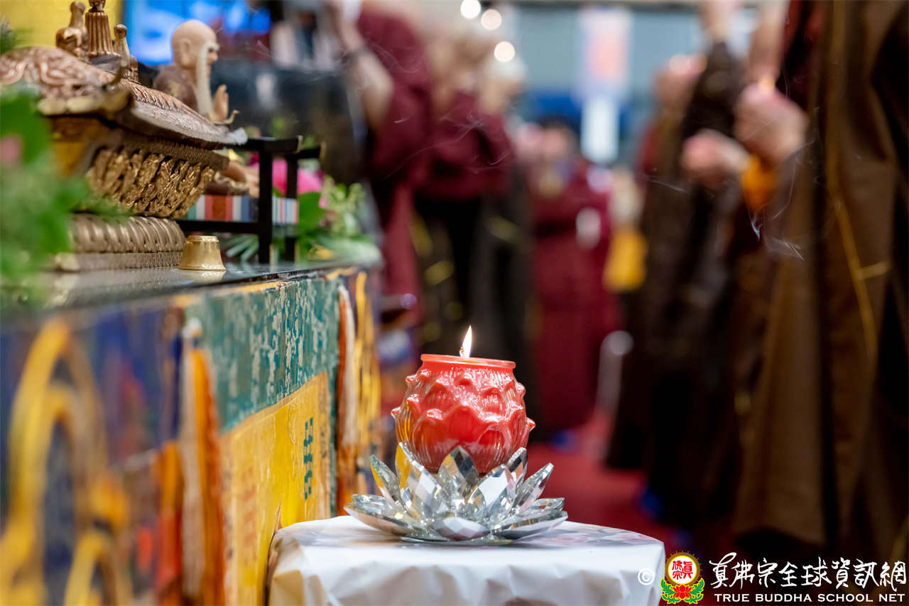 接著,進行莊嚴隆重的傳燈儀式,根本上師點亮大眾的心燈,然後大眾唱請佛住世祈願文、供養僧眾、唱宗歌「感恩真佛」。
