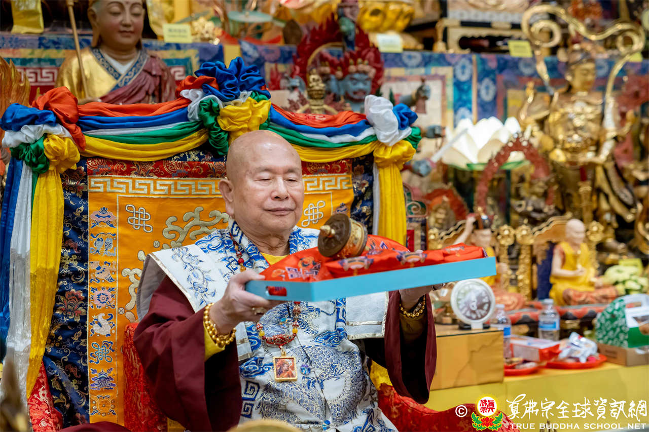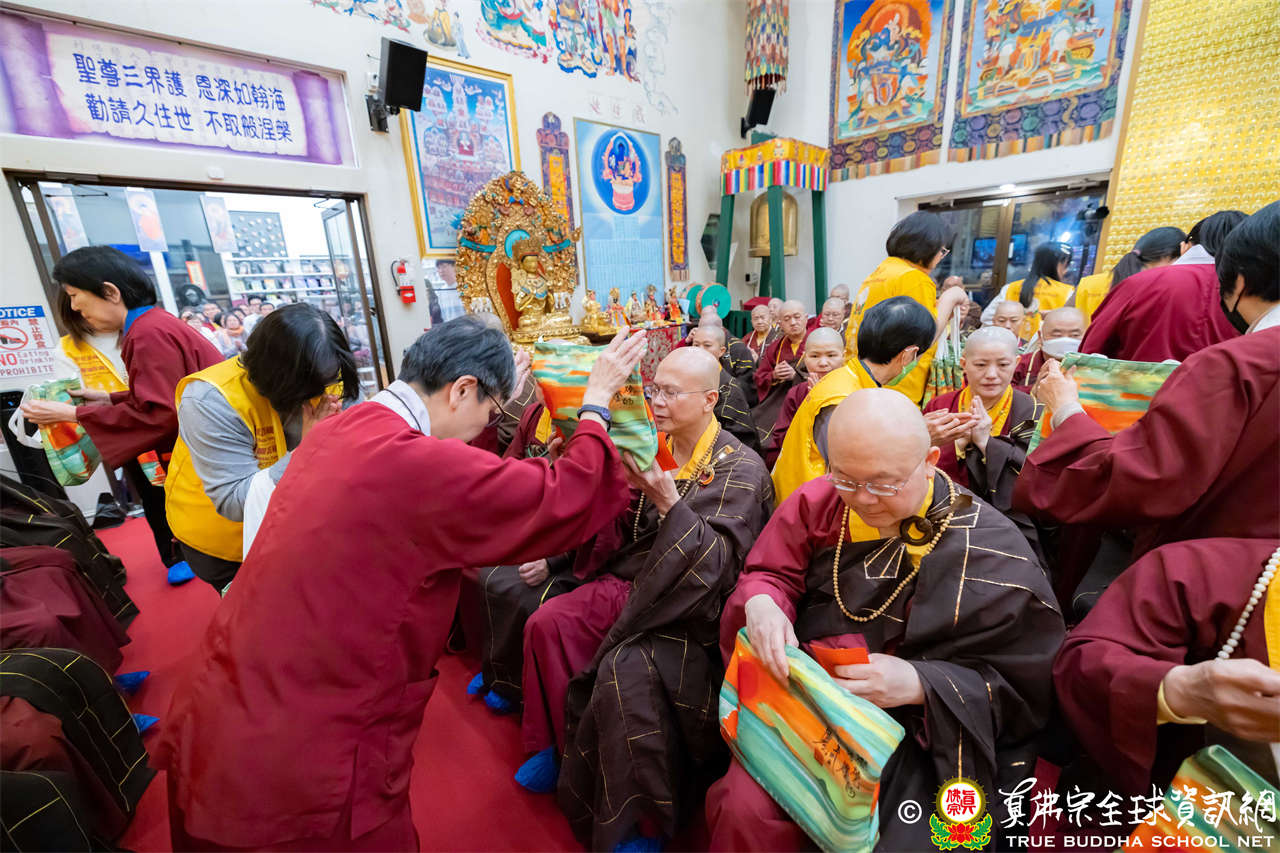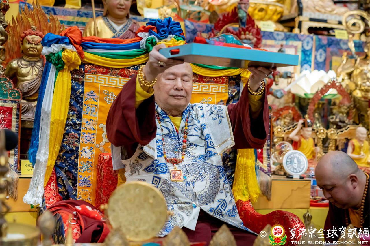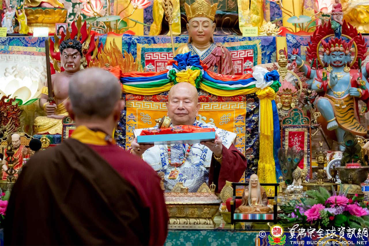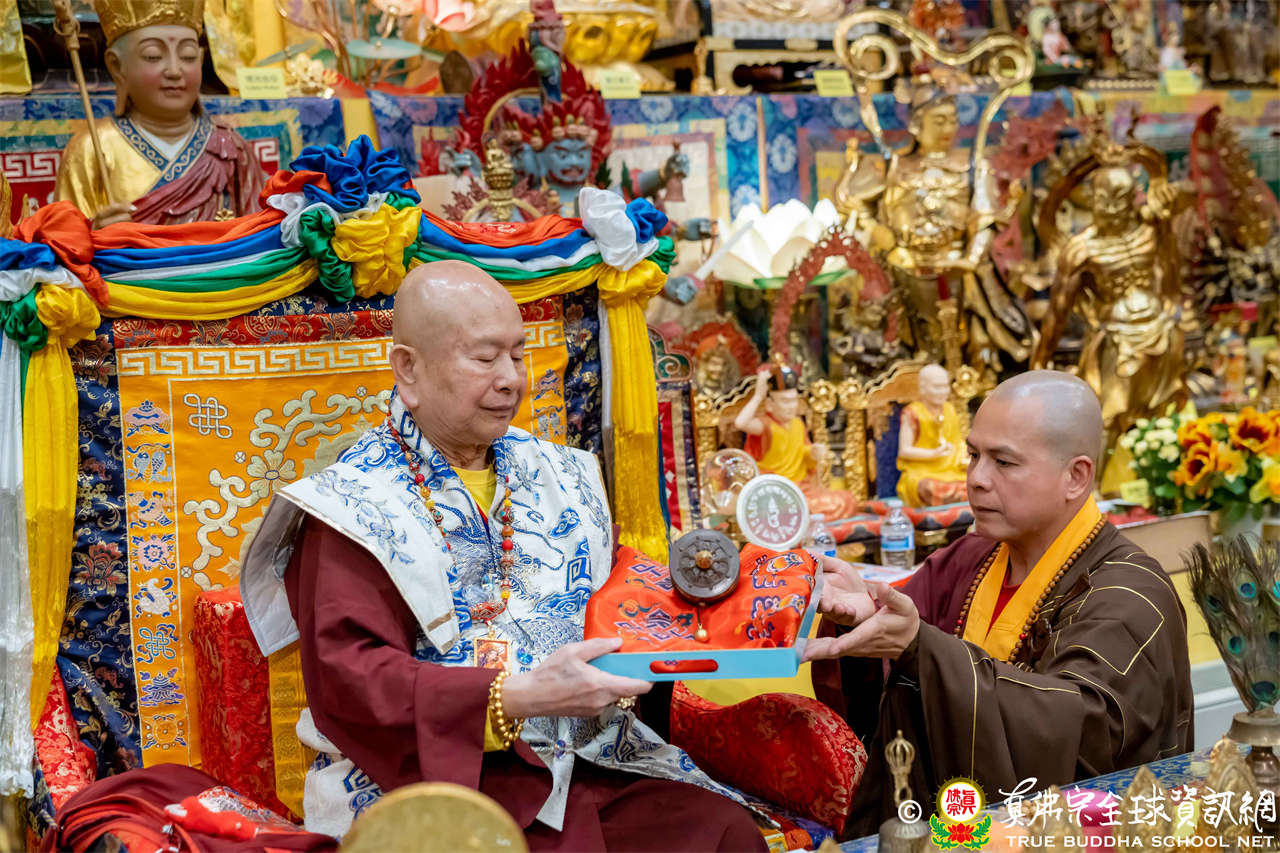 接著,進行莊嚴隆重的傳燈儀式,根本上師點亮大眾的心燈,然後大眾唱請佛住世祈願文、供養僧眾、唱宗歌「感恩真佛」。