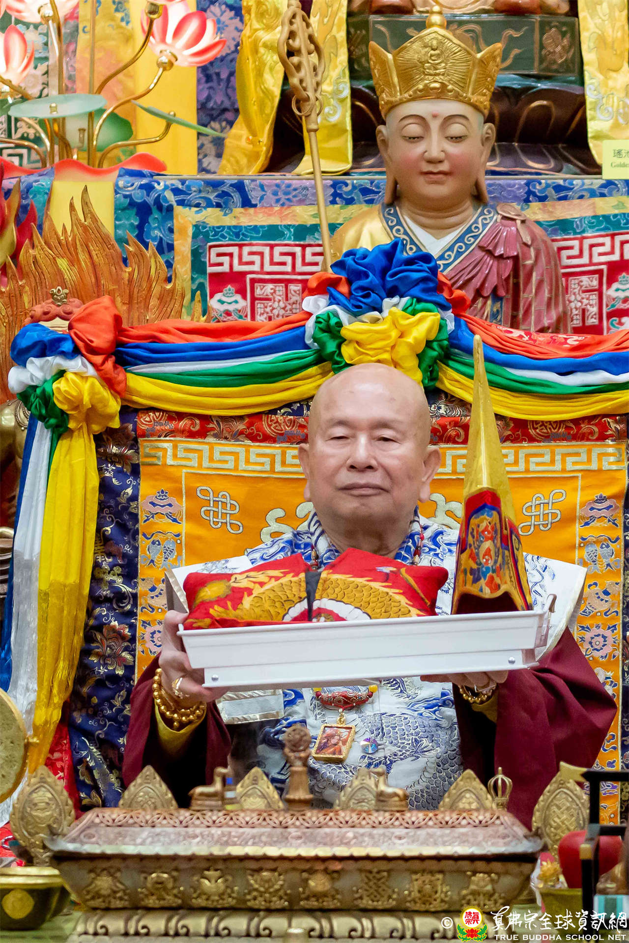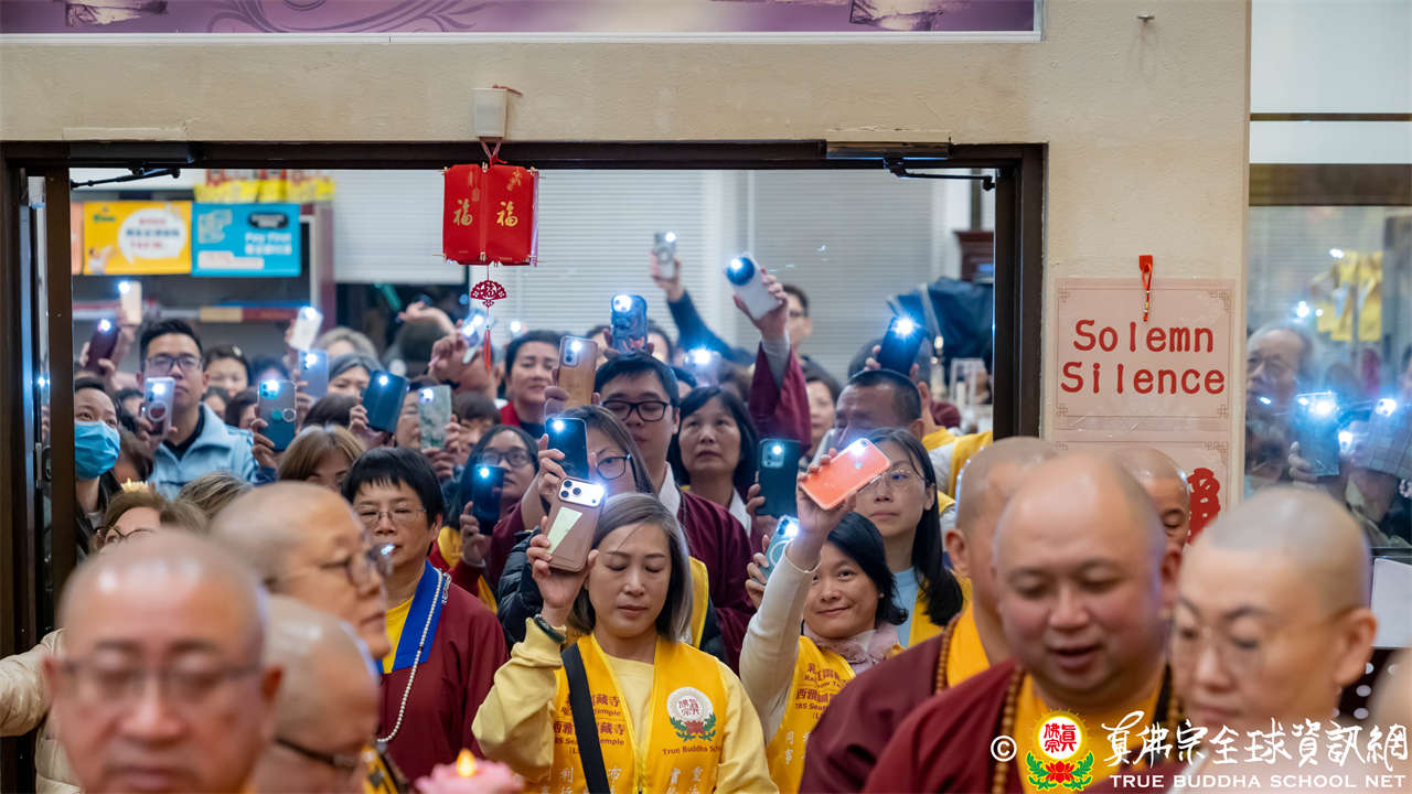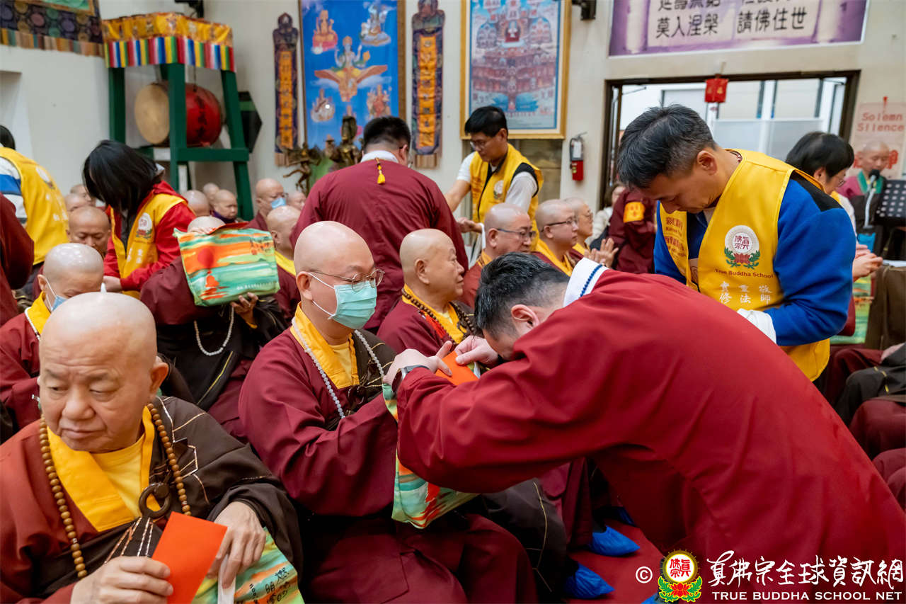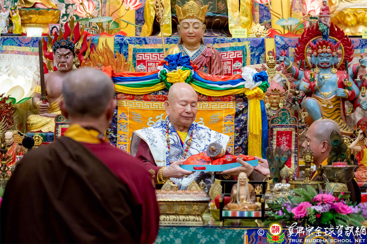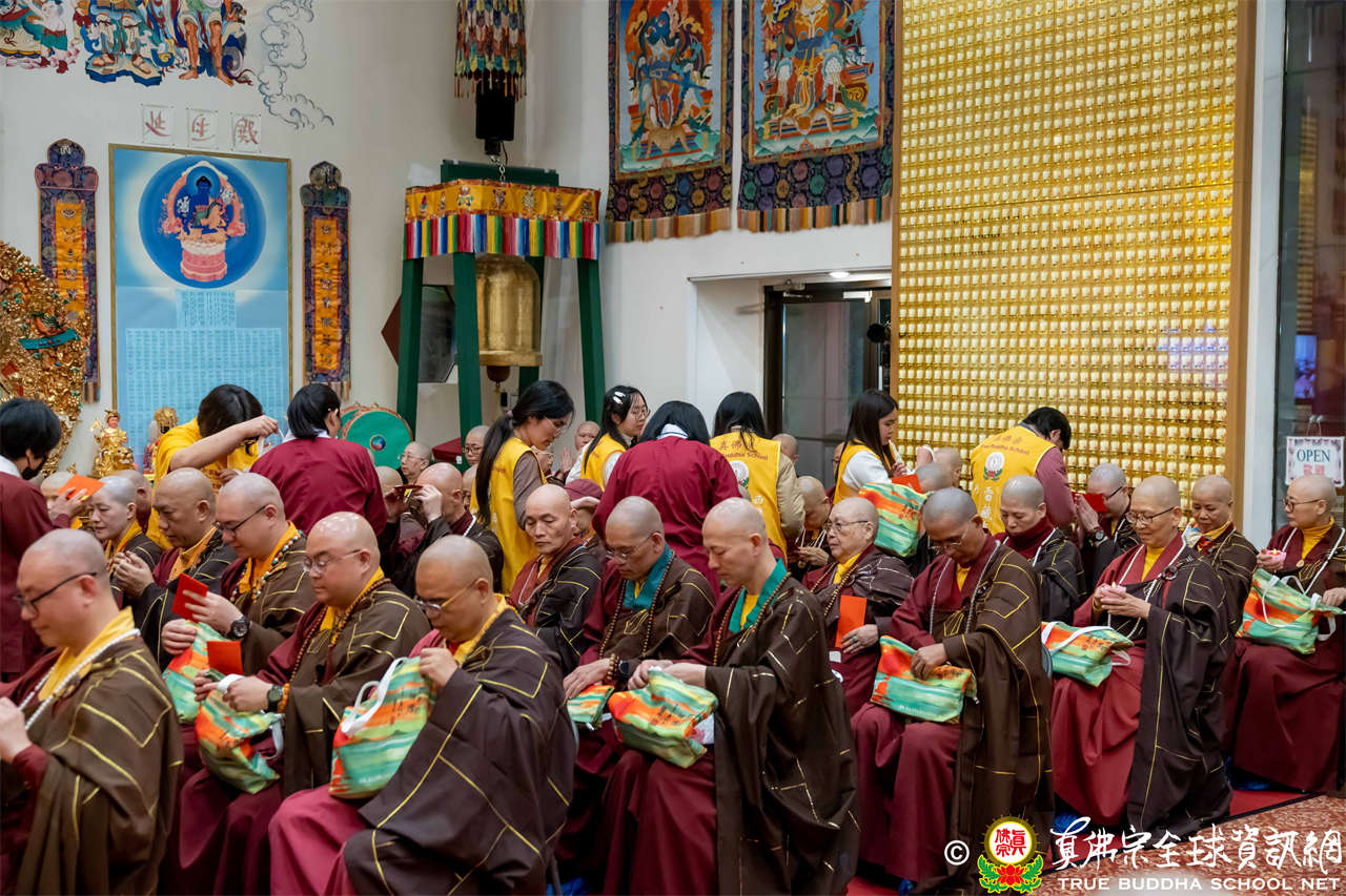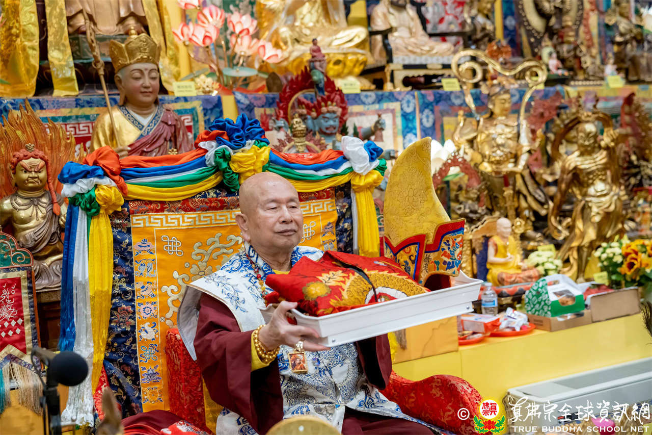 接著,進行莊嚴隆重的傳燈儀式,根本上師點亮大眾的心燈,然後大眾唱請佛住世祈願文、供養僧眾、唱宗歌「感恩真佛」。