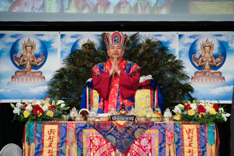 接著由西雅圖雷藏寺代表敬獻哈達,主持上師加持疏文及報名表後,蓮嶝上師以一偈:「認知師法、淨土光明、日日實修、見性成佛」掀開了新春祈福大法會的序幕,大眾虔誠奉誦妙法蓮華經觀世音菩薩普門品及大乘諸品咒章,法會儀軌順暢圓滿。