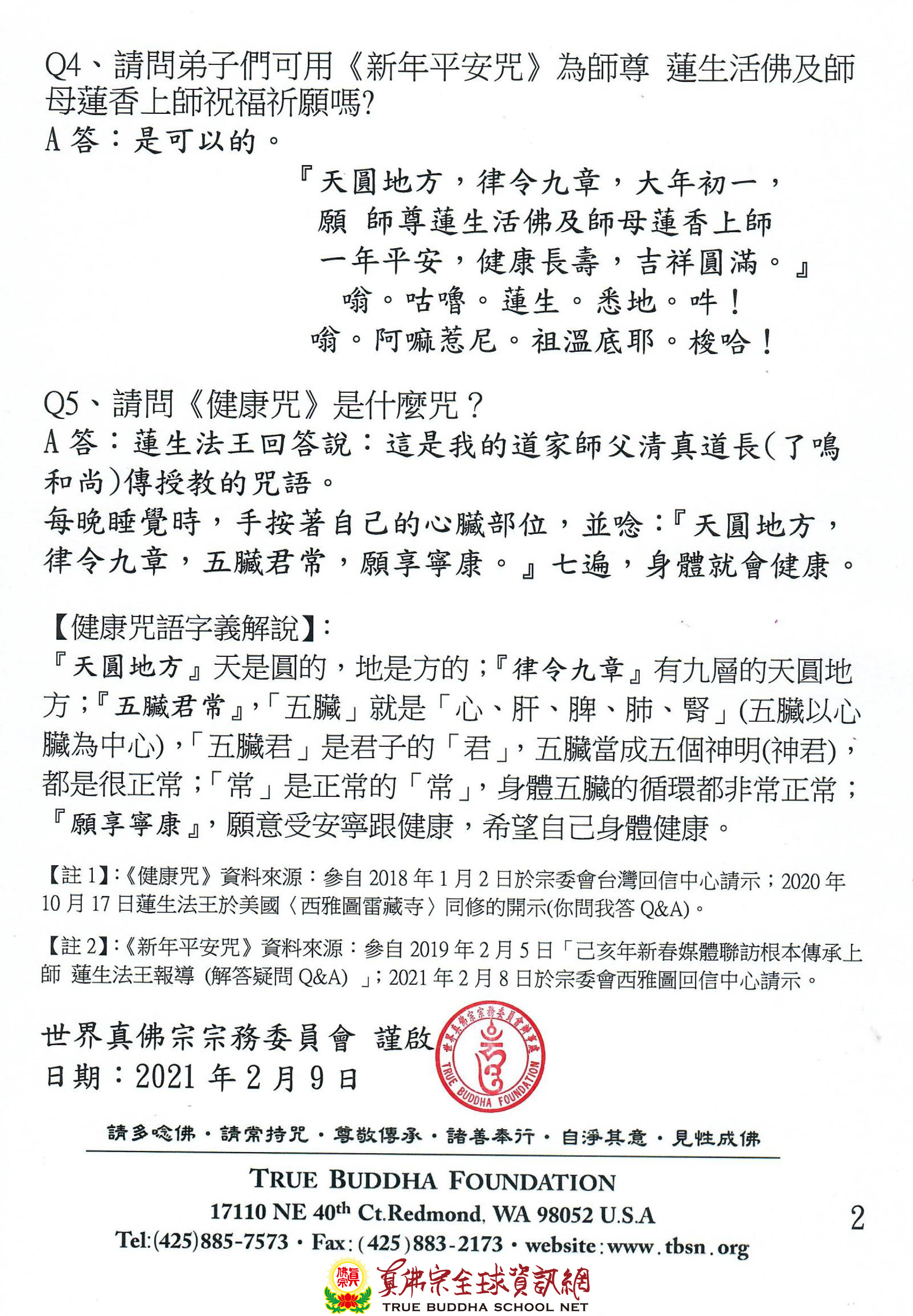 【註2】:《新年平安咒》資料來源:參自2019年2月5日「己亥年新春媒體聯訪根本傳承上師 蓮生法王報導 (解答疑問Q&A) 」;2021年2月8日於宗委會西雅圖回信中心請示。