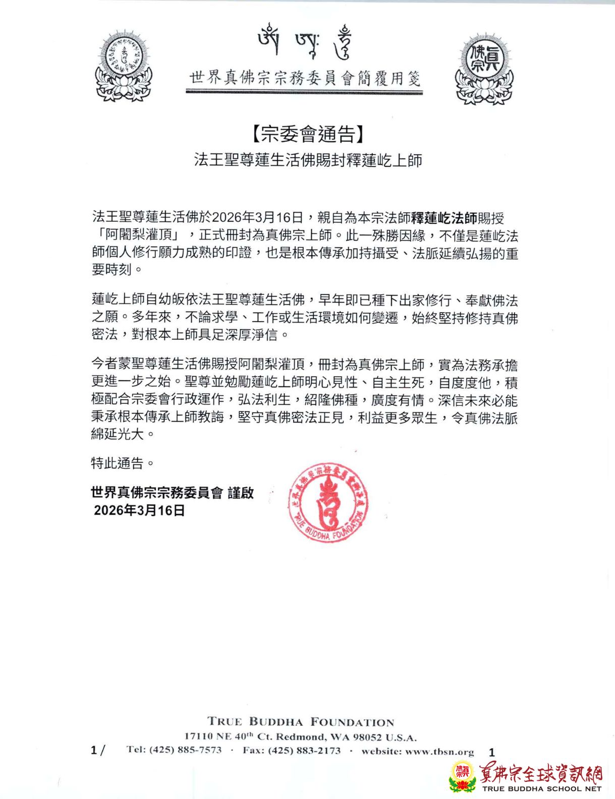 【宗委會通告】法王聖尊蓮生活佛賜封釋蓮屹上師