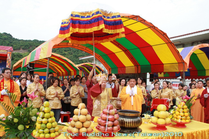 灌頂的意思就是說,把佛的種子灑在眾生的心田。它的來源是從天上請下佛的種子,上師必需要召請佛菩薩下降,先灌頂上師,再由上師引到這個金身的身上,再從金身的身上,灌頂大家。因為有了佛的種子在你的心田,你才能夠發芽,變成樹,變成修行有成就。它會開花結果,你們就得到果位。