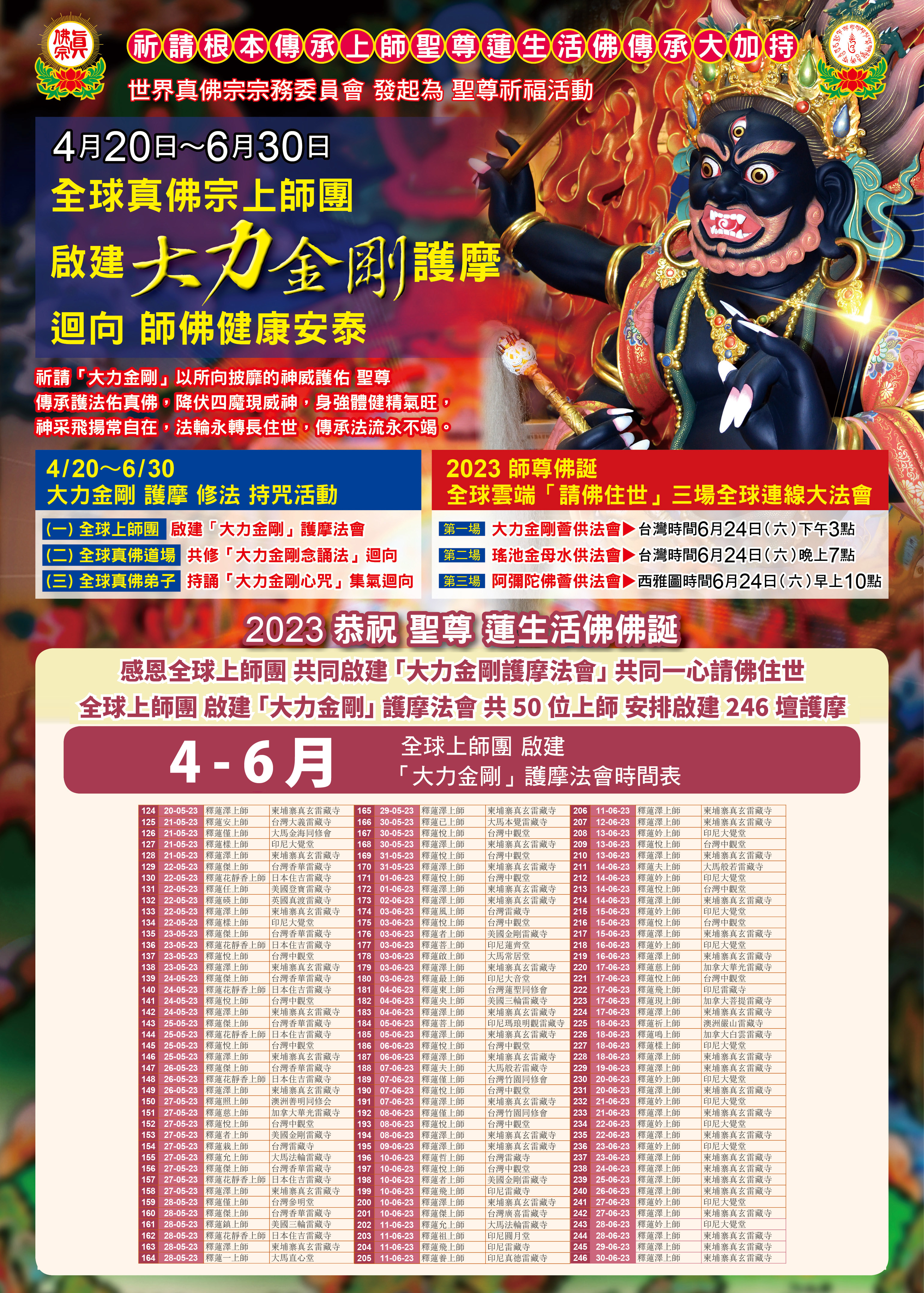 緊跟著真佛宗同門的「兩千萬」大力金剛心咒的供養,真佛宗上師們為師佛啟建的大力金剛護摩也出現突破,截至2023/5/16,總共有50位上師登記並舉辦共246壇護摩火供,迴向師佛健康安泰,請佛住世!