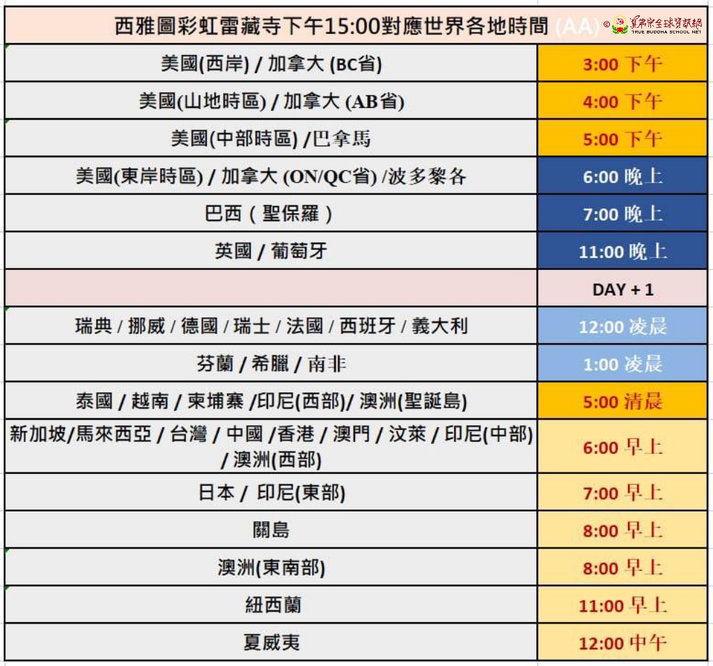 紐西蘭調時 彩虹雷藏寺法會時間表2023年9月24日更換、西雅圖雷藏寺同修時間表2023年9月30日更換