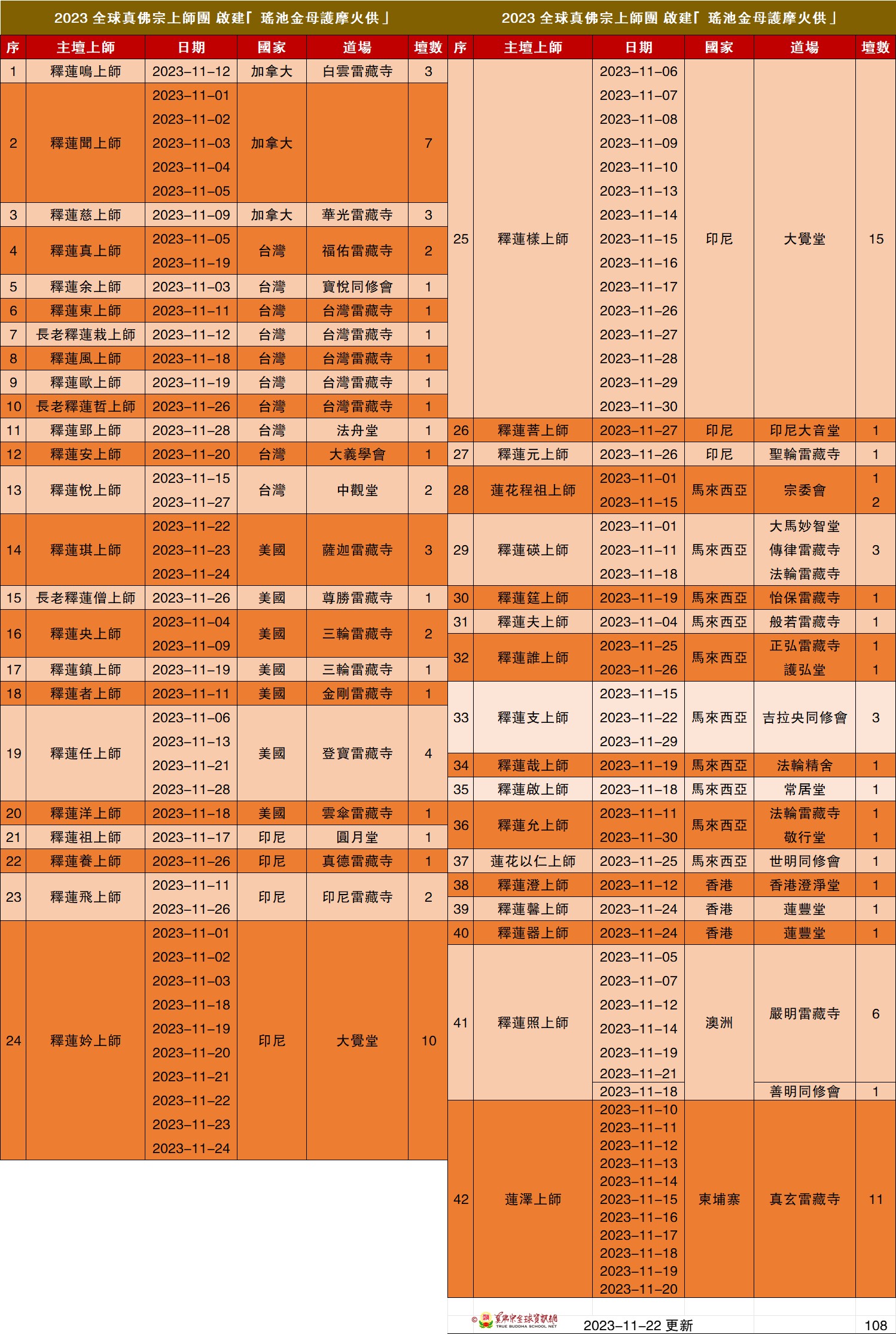 目前共有42位上師啟建108壇瑤池金母護摩火供迴向 師佛, 而登記將於11月25-26日舉辦瑤池金母薈供法會的真佛宗道場共有大約99個道場,合共98壇。