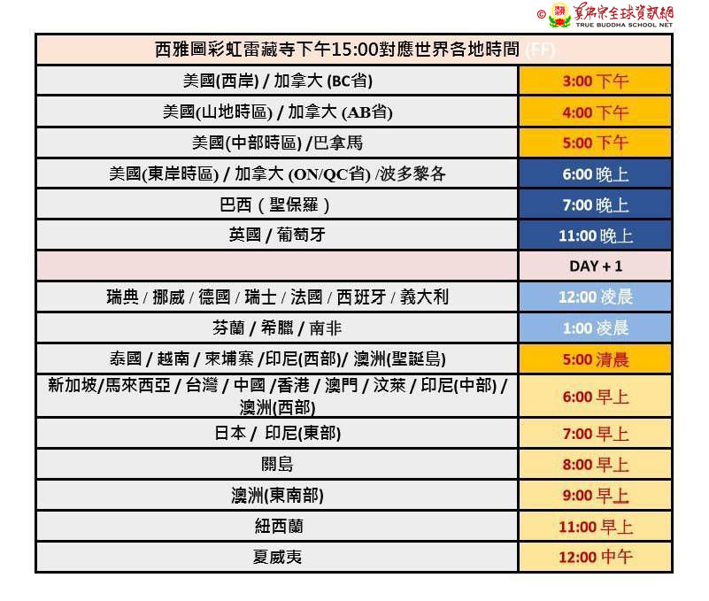 溫馨提醒:歐洲調時,彩虹雷藏寺和西雅圖雷藏寺世界對照時間表2024-03-31已更改