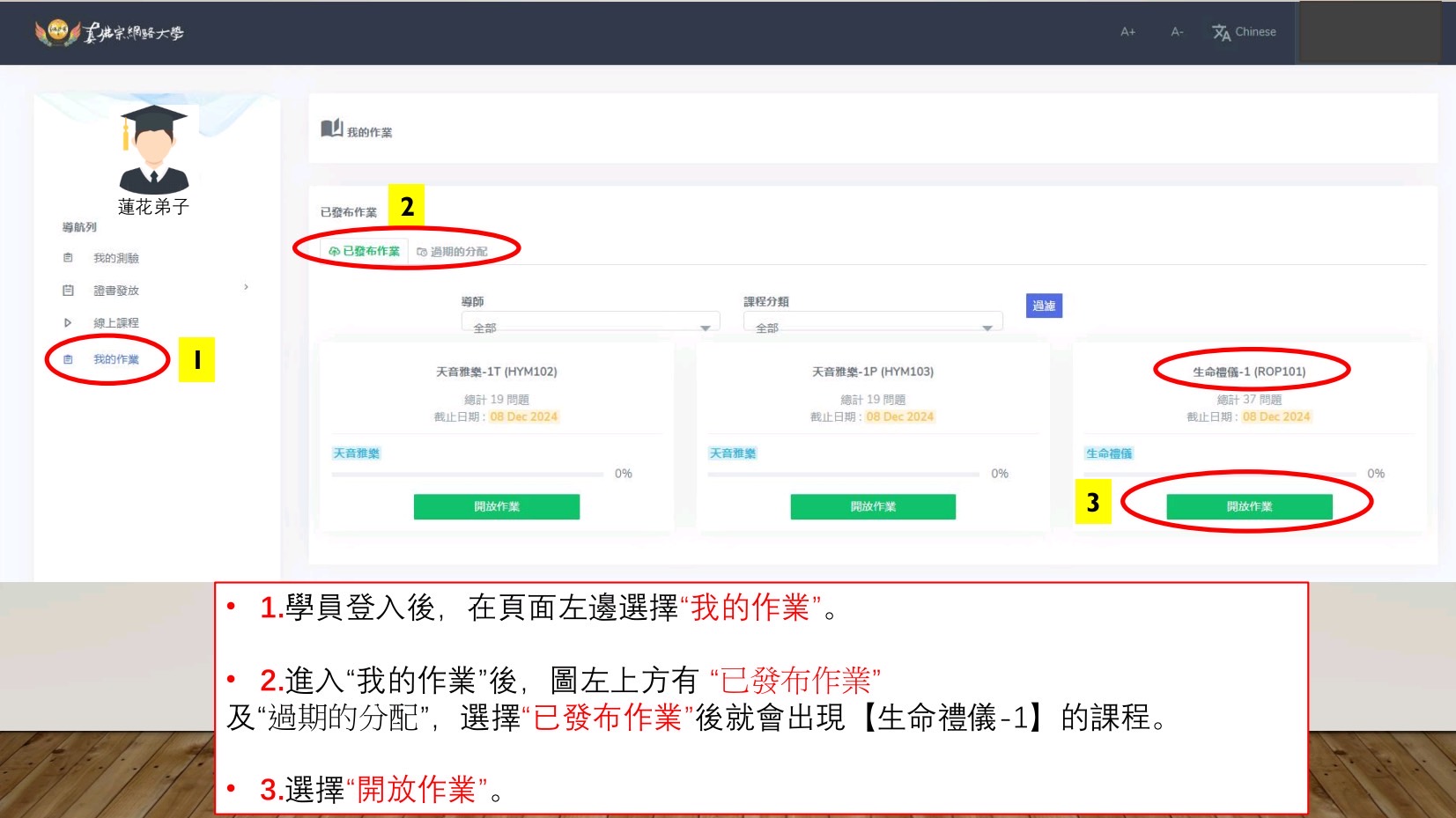 (所有作業學員需自己提交到真佛網絡大學內,逾期提交之作業將不受理)