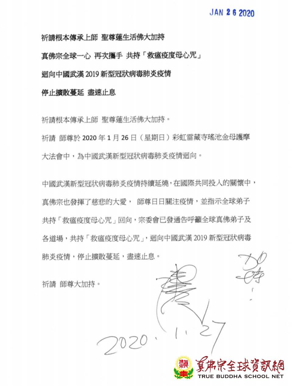根據馬來西亞星洲日報報導,新冠肺炎瘟疫在多個國家已經出現確診病例,宗委會呼籲眾同門共持「除瘟疫度母心咒」,迴向2019新型冠狀病毒肺炎疫情停止擴散蔓延 盡速止息!