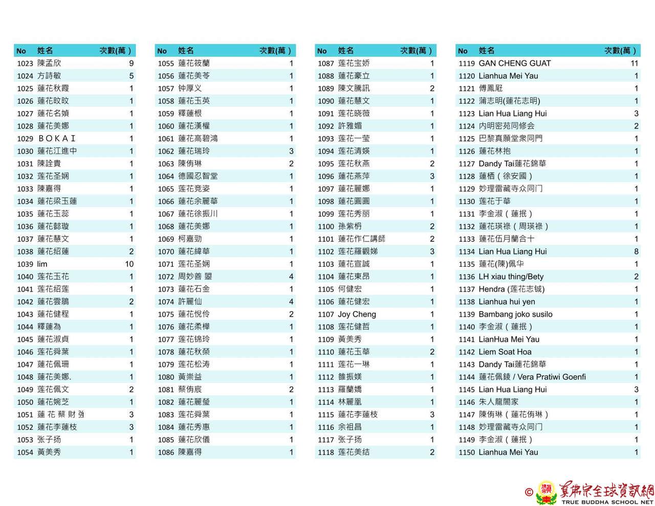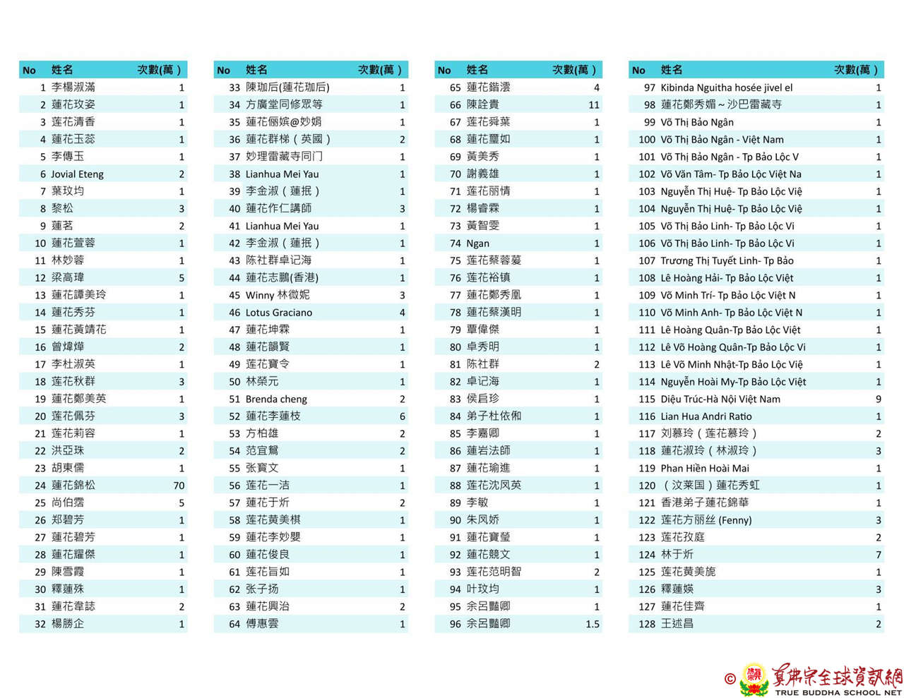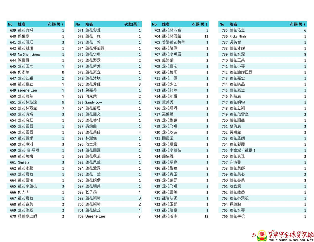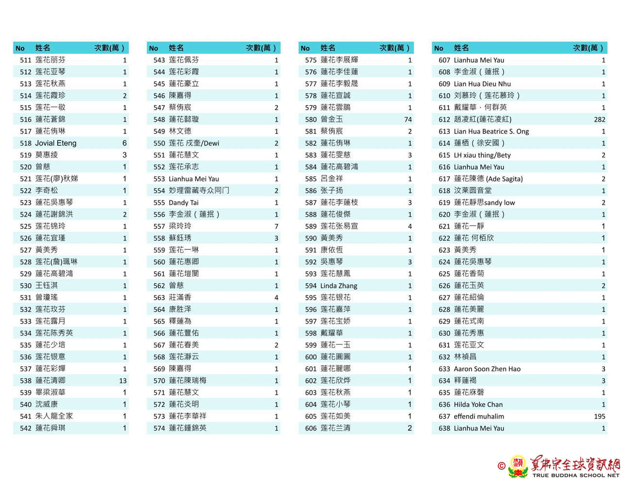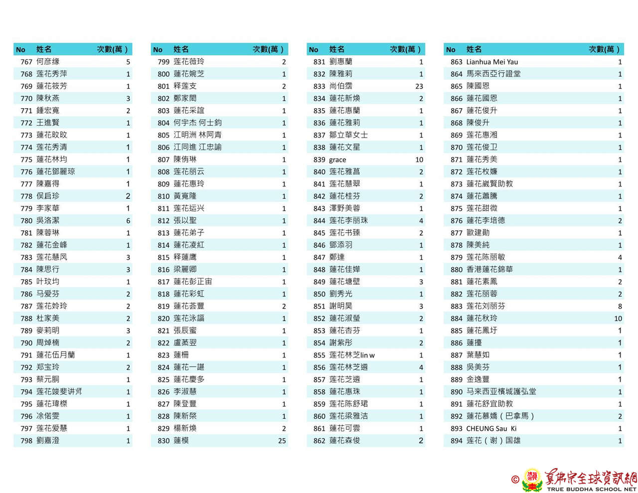 持誦金母心咒迴向師佛 全球真佛弟子一心持誦瑤池金母心咒 祈求瑤池金母大天尊光明守護師佛。 截至2025/4/25日傍晚,持誦瑤池金母心咒累積數目已達2765萬遍,在此呈上目前所登記於真佛宗全球資訊網TBSN的名單。 感謝所有持咒迴向的同門!讓我們再接再厲,以千萬遍金母心咒,向慈悲的無極瑤池金母大天尊祈求,集氣迴向 師佛安康無恙,自在任運! 持咒登記處: https://ch.tbsn.org/event/blessing2025