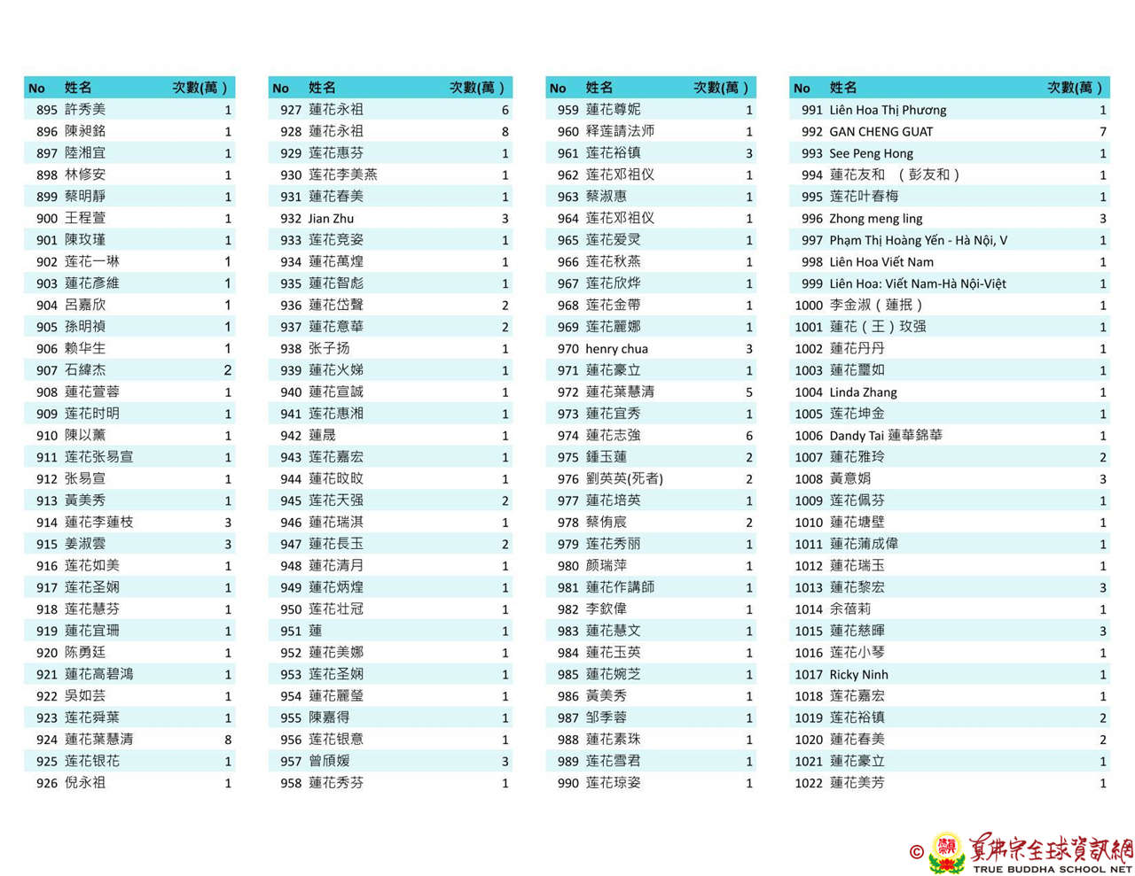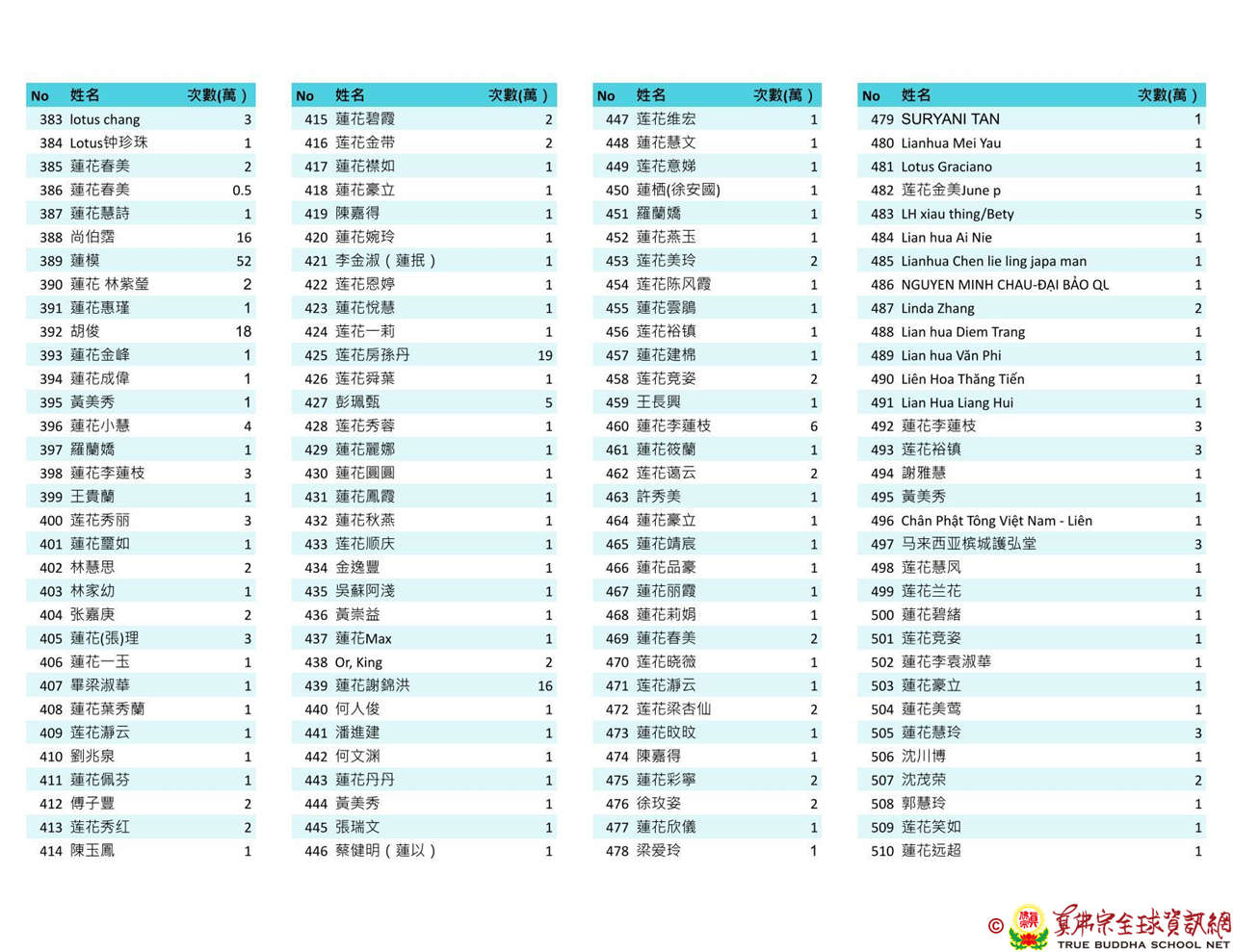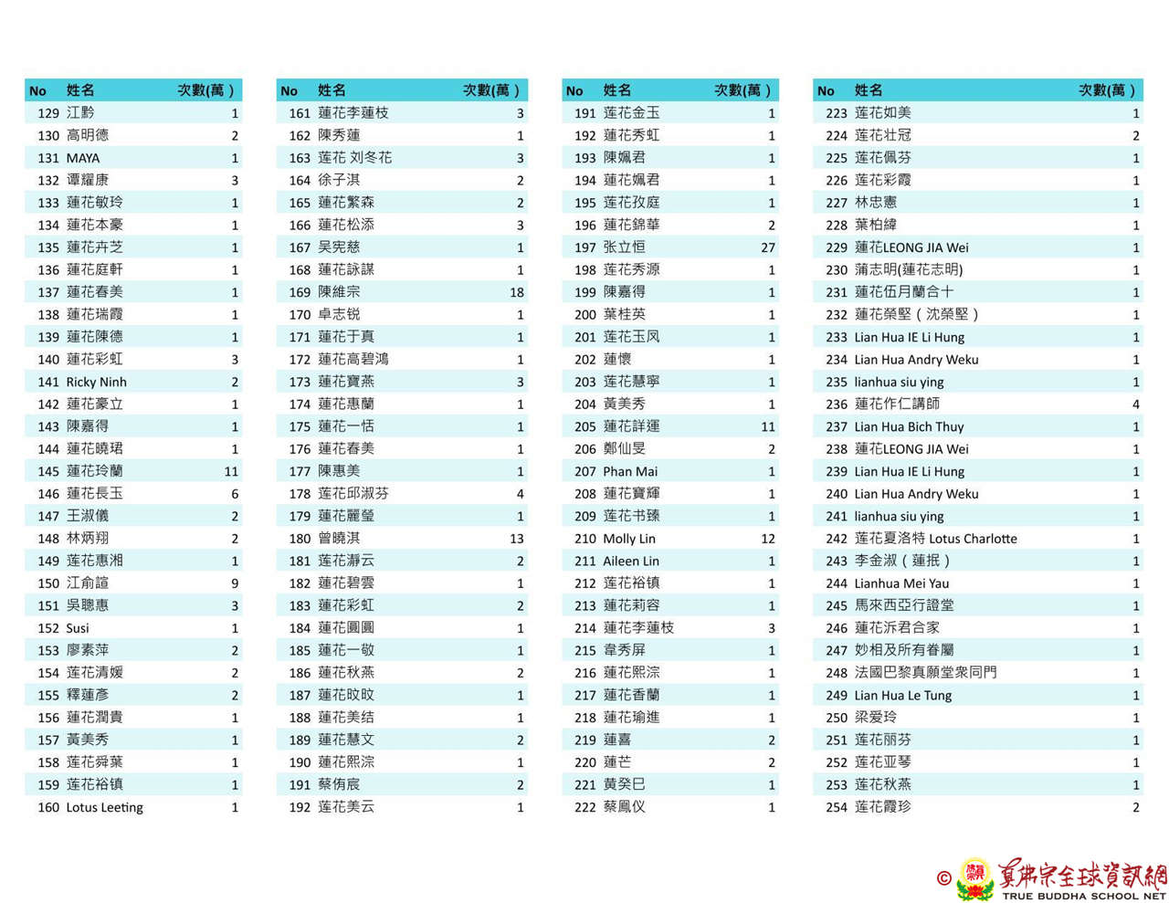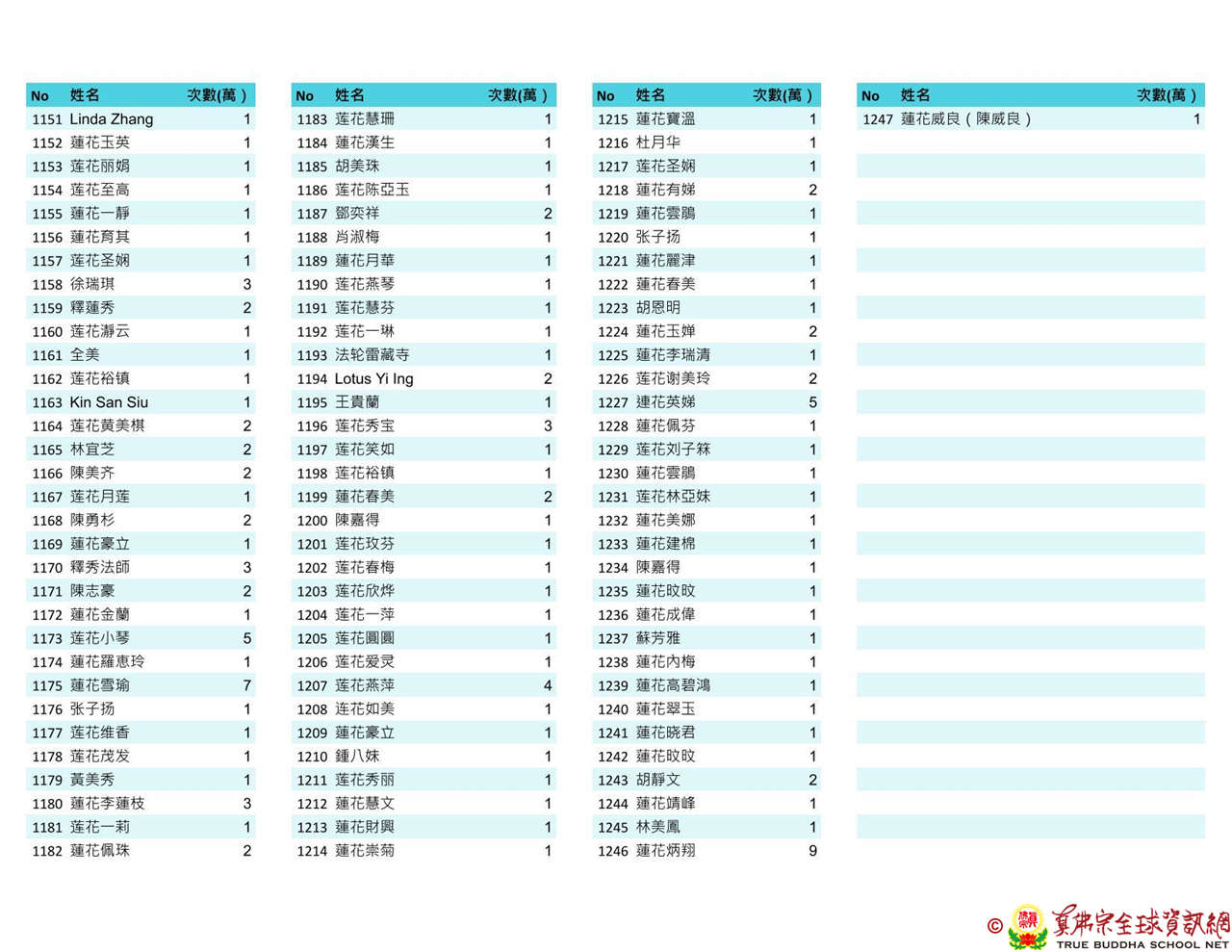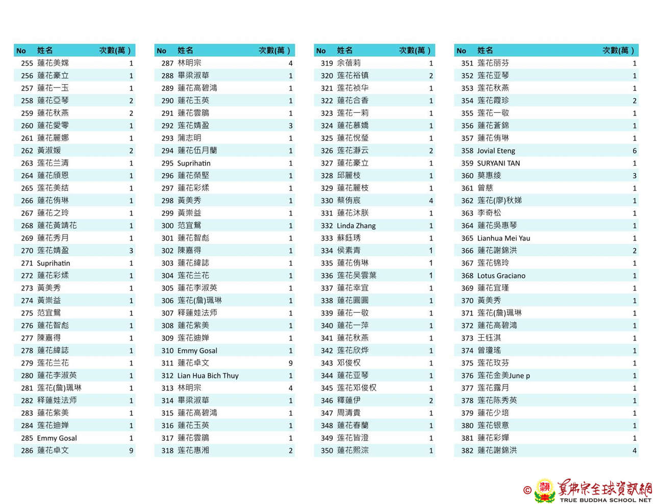 持誦金母心咒迴向師佛 全球真佛弟子一心持誦瑤池金母心咒 祈求瑤池金母大天尊光明守護師佛。 截至2025/4/25日傍晚,持誦瑤池金母心咒累積數目已達2765萬遍,在此呈上目前所登記於真佛宗全球資訊網TBSN的名單。 感謝所有持咒迴向的同門!讓我們再接再厲,以千萬遍金母心咒,向慈悲的無極瑤池金母大天尊祈求,集氣迴向 師佛安康無恙,自在任運! 持咒登記處: https://ch.tbsn.org/event/blessing2025