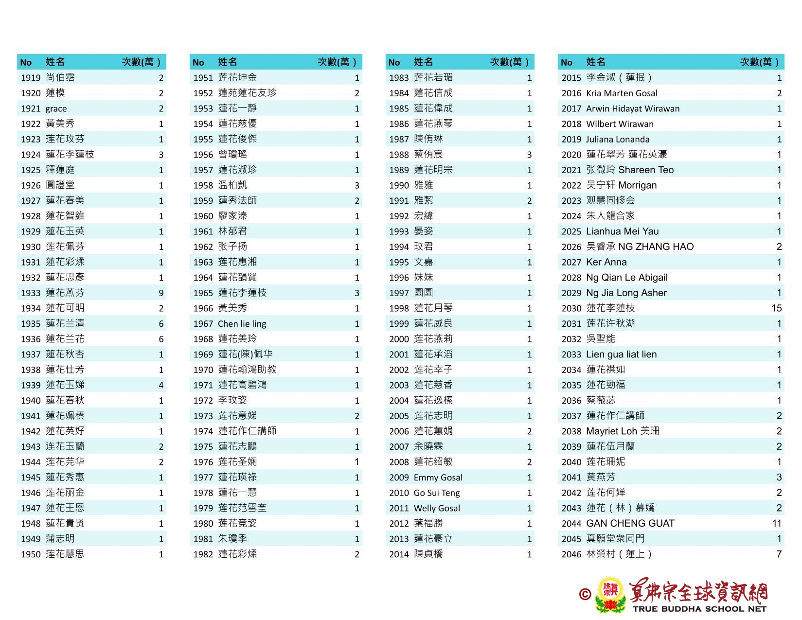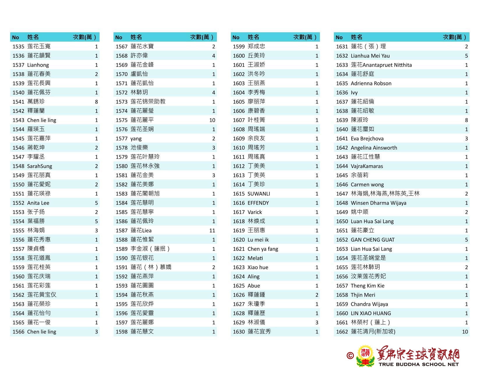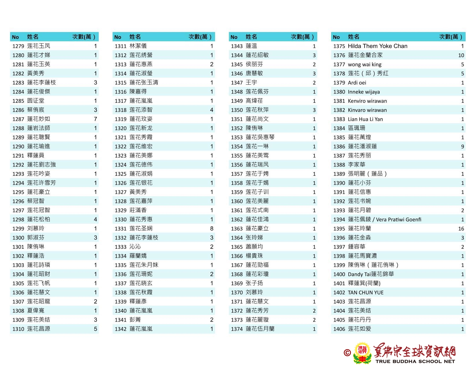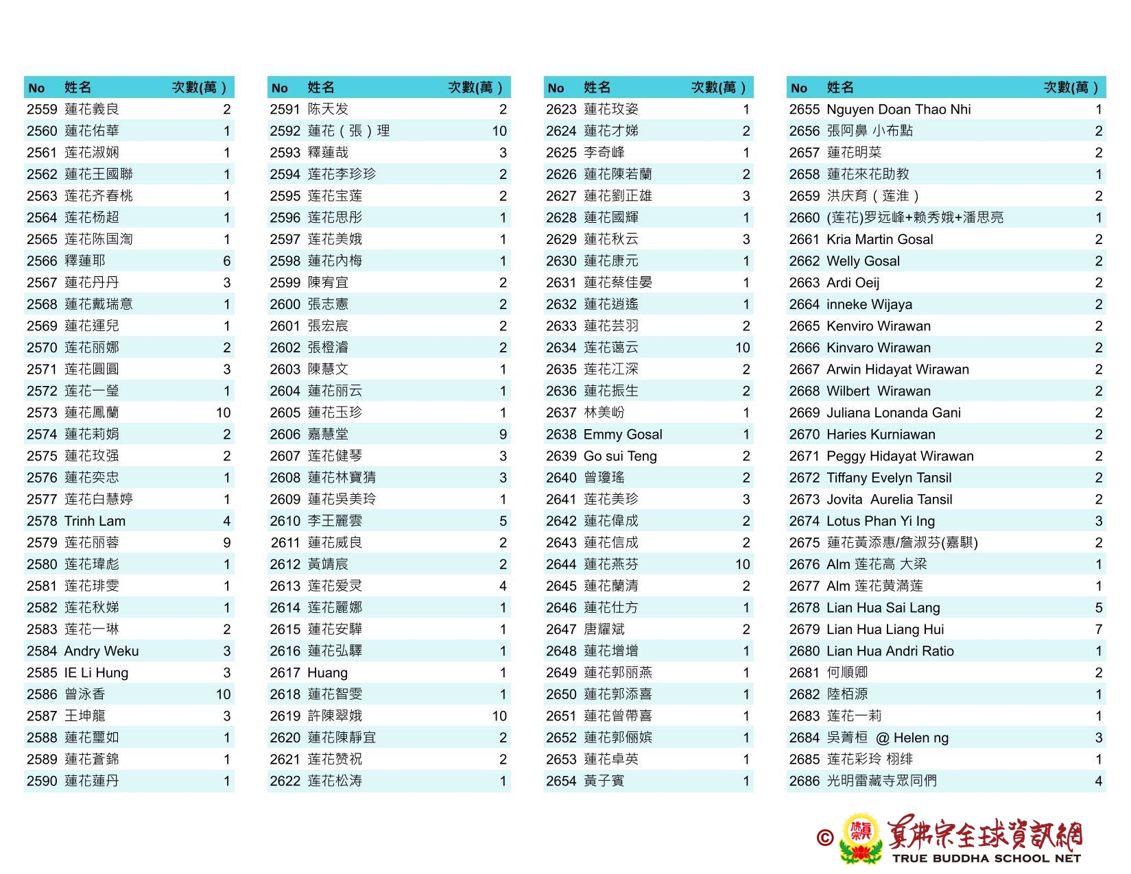 持誦金母心咒迴向師佛 全球真佛弟子一心持誦瑤池金母心咒 祈求瑤池金母大天尊光明守護師佛。 截至2025/05/25日傍晚,持誦瑤池金母心咒累積數目已達5906萬遍,在此呈上目前所登記於真佛宗全球資訊網TBSN的名單。 感謝所有持咒迴向的同門!讓我們再接再厲,以千萬遍金母心咒,向慈悲的無極瑤池金母大天尊祈求,集氣迴向 師佛安康無恙,自在任運! 持咒登記處: https://ch.tbsn.org/event/blessing2025