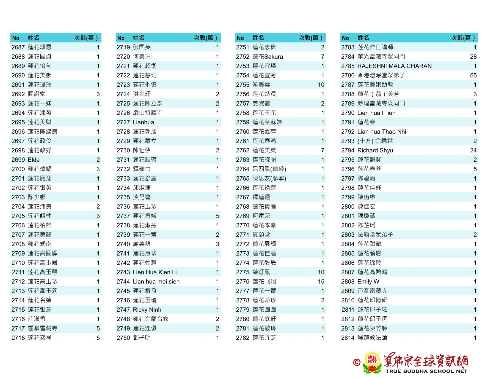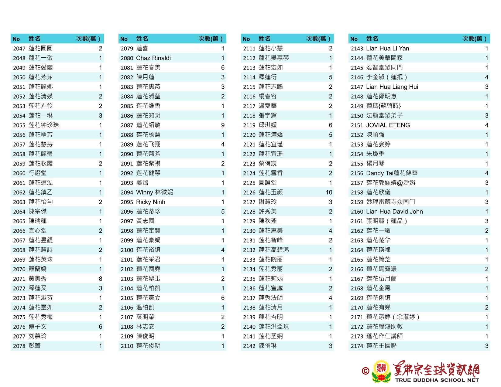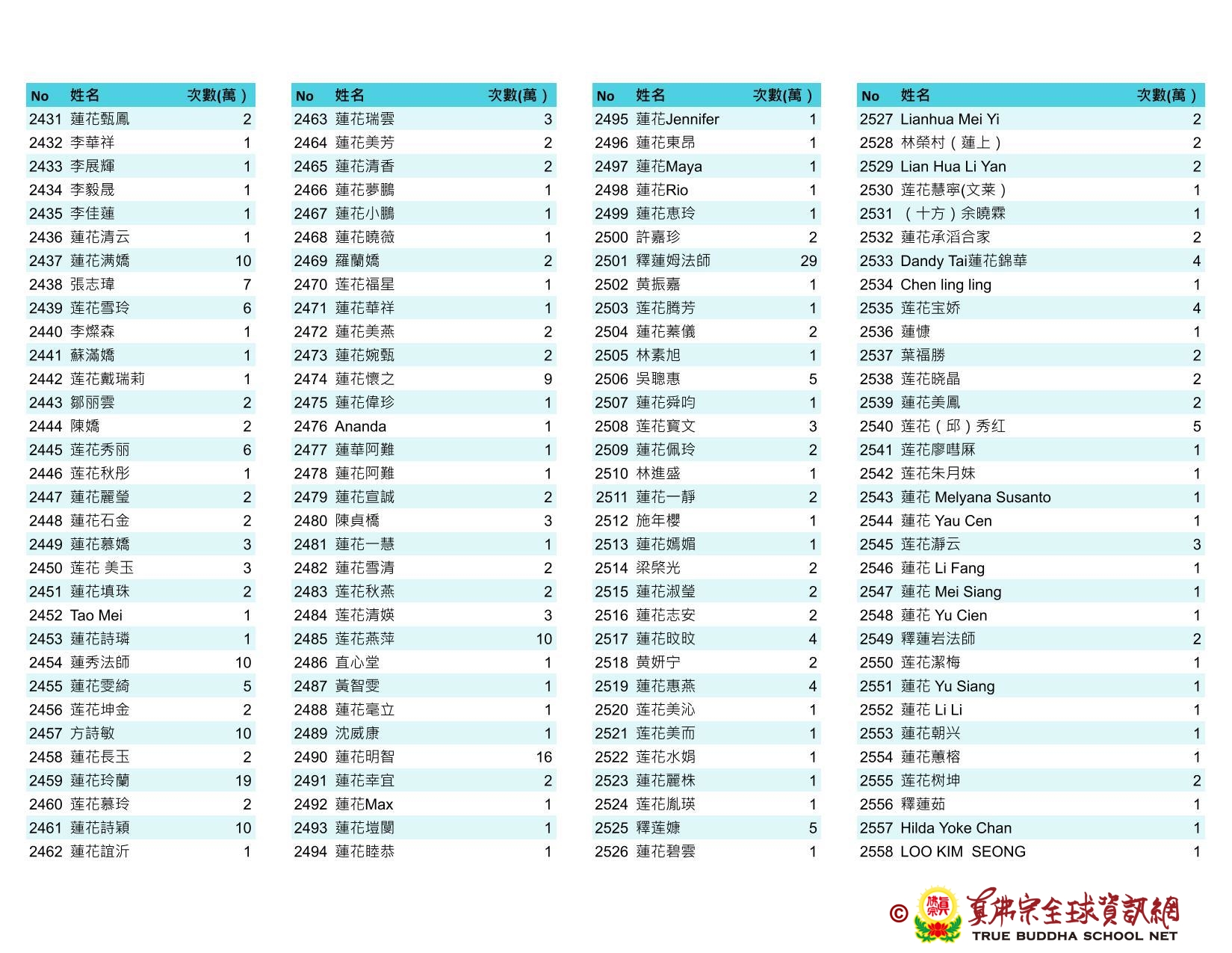 持誦金母心咒迴向師佛 全球真佛弟子一心持誦瑤池金母心咒 祈求瑤池金母大天尊光明守護師佛。 截至2025/05/25日傍晚,持誦瑤池金母心咒累積數目已達5906萬遍,在此呈上目前所登記於真佛宗全球資訊網TBSN的名單。 感謝所有持咒迴向的同門!讓我們再接再厲,以千萬遍金母心咒,向慈悲的無極瑤池金母大天尊祈求,集氣迴向 師佛安康無恙,自在任運! 持咒登記處: https://ch.tbsn.org/event/blessing2025