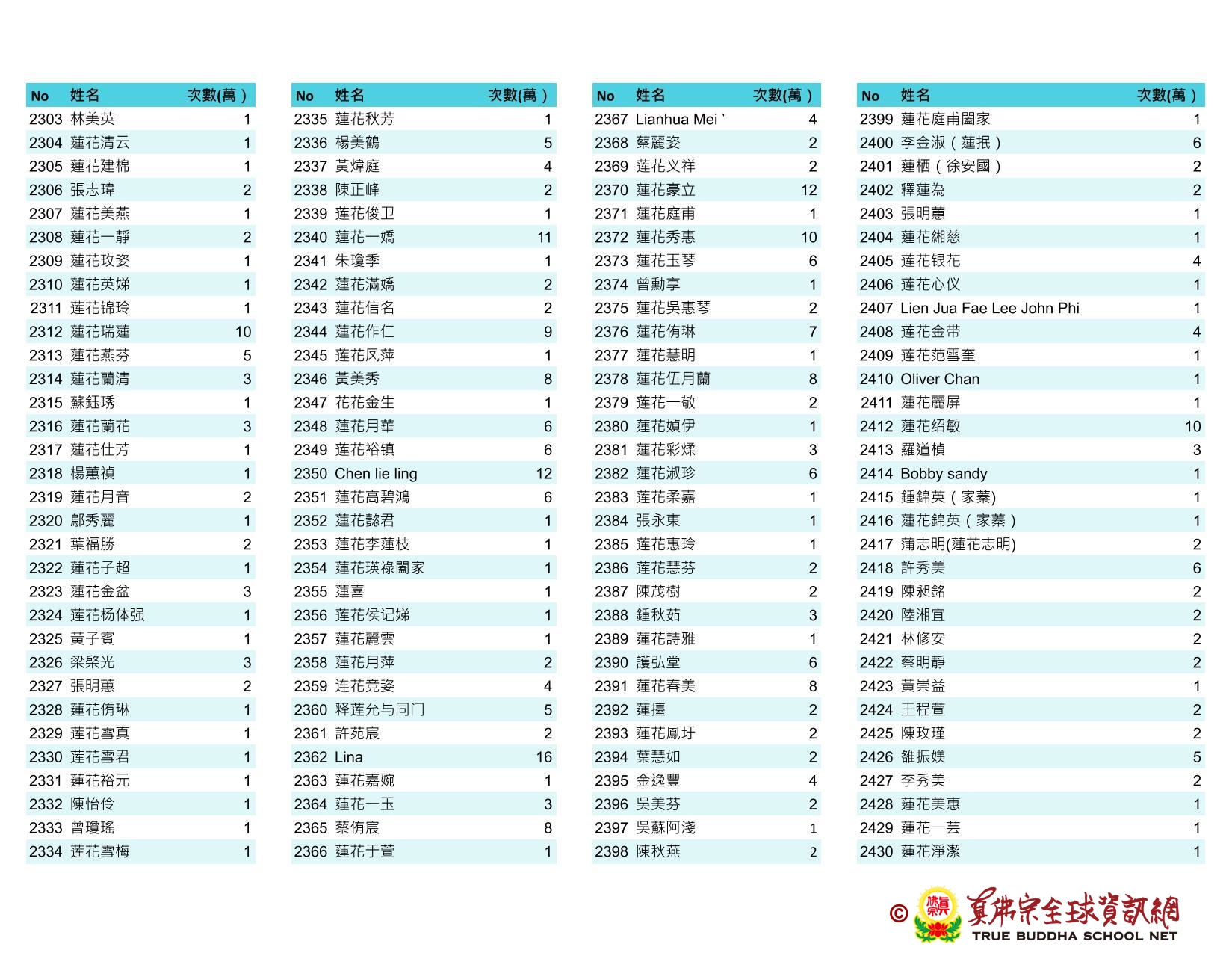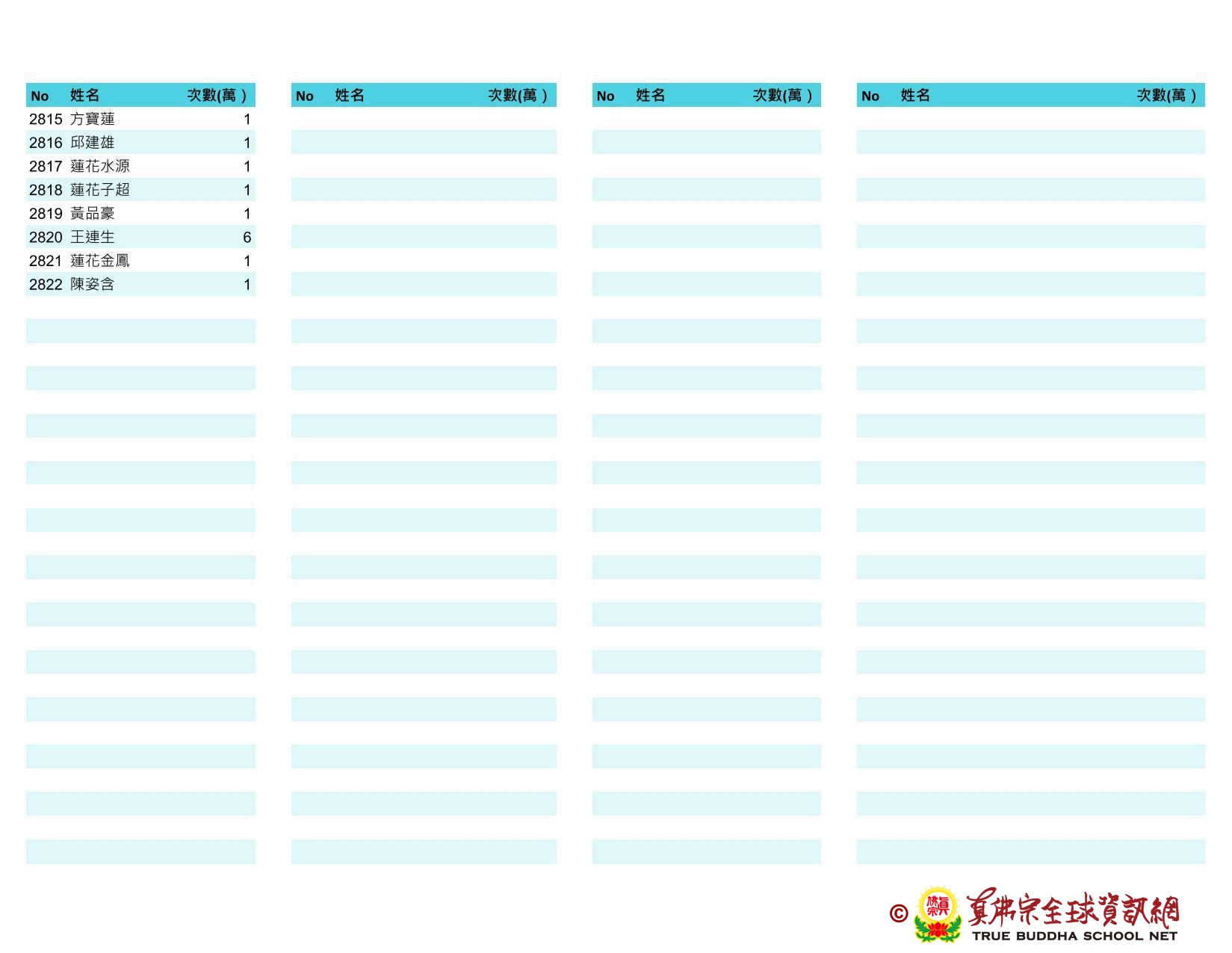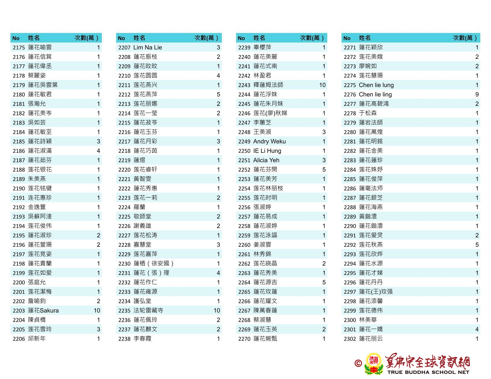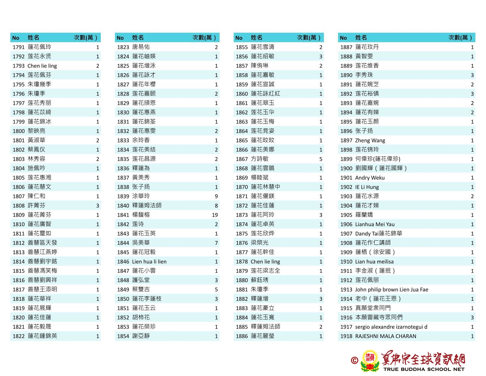 持誦金母心咒迴向師佛 全球真佛弟子一心持誦瑤池金母心咒 祈求瑤池金母大天尊光明守護師佛。 截至2025/05/25日傍晚,持誦瑤池金母心咒累積數目已達5906萬遍,在此呈上目前所登記於真佛宗全球資訊網TBSN的名單。 感謝所有持咒迴向的同門!讓我們再接再厲,以千萬遍金母心咒,向慈悲的無極瑤池金母大天尊祈求,集氣迴向 師佛安康無恙,自在任運! 持咒登記處: https://ch.tbsn.org/event/blessing2025
