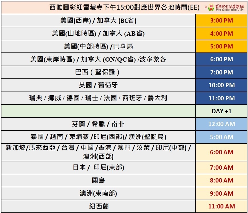 溫馨提醒:北美調時,西雅圖雷藏寺和彩虹雷藏寺同修法會世界對照時間表,2026年3月8日開始更換