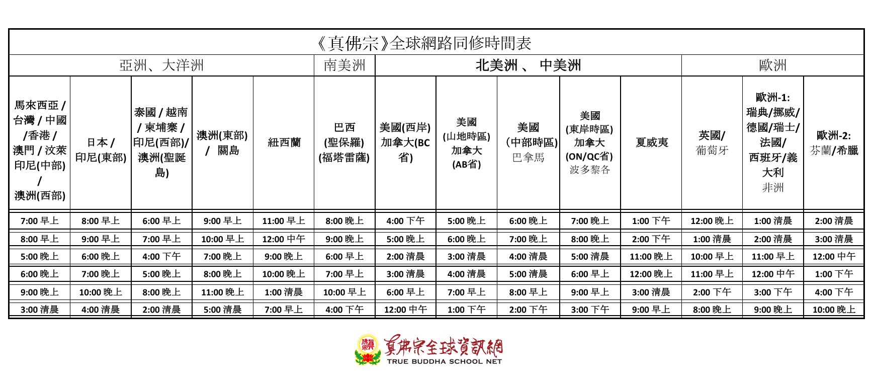 為了響應師尊的諄諄教導,推動真佛弟子的每日精進實修,宗委會已於2019年9月9日起,開辦「真佛宗全球網路同修」,現在新增時間表為: 每星期一到星期五,每天六個時段,見附表。