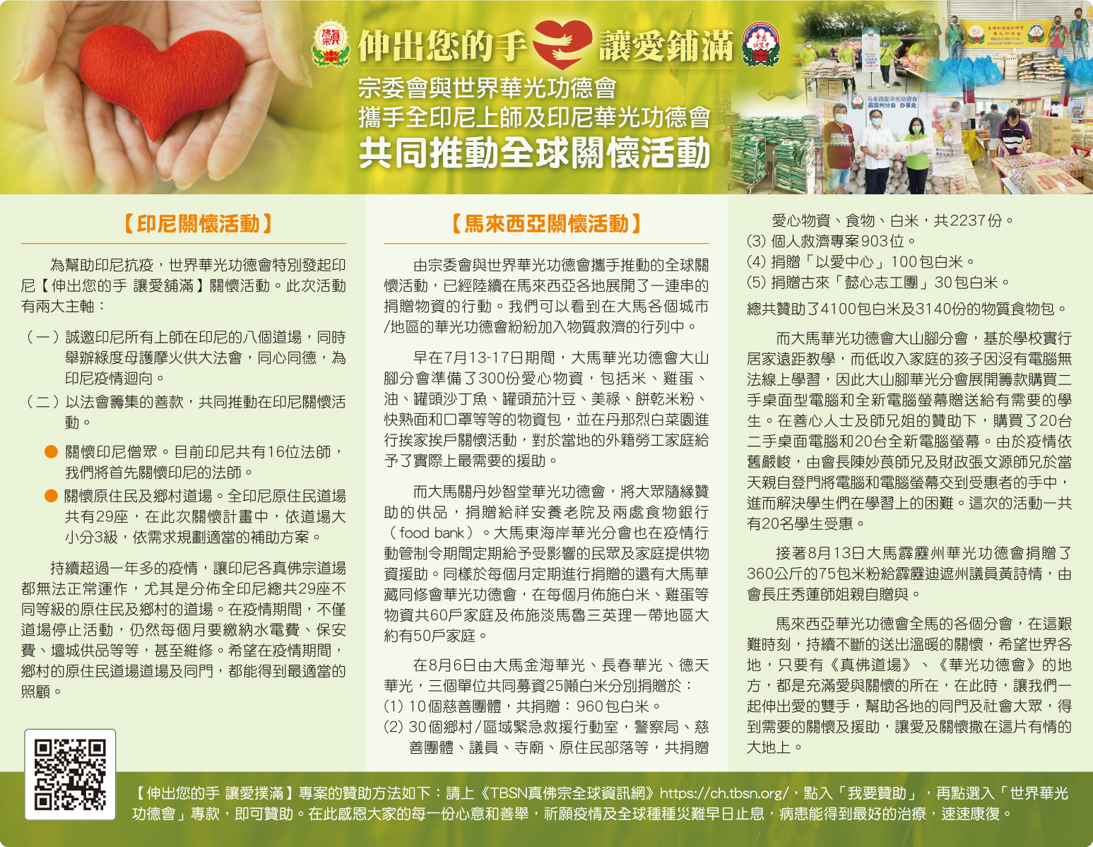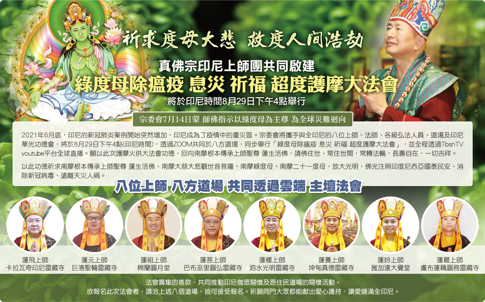 2021年6月底,印尼的新冠肺炎案例開始突然增加,印尼成為了疫情中的重災區。宗委會將攜手與全印尼的八位上師、法師、各級弘法人員、道場及印尼華光功德會,將於8月29日下午4點(印尼時間),透過ZOOM共同於八方道場,同步舉行「綠度母除瘟疫 息災 祈福 超度護摩大法會」,並全程透過TbsnTV youtube平台全球直播。