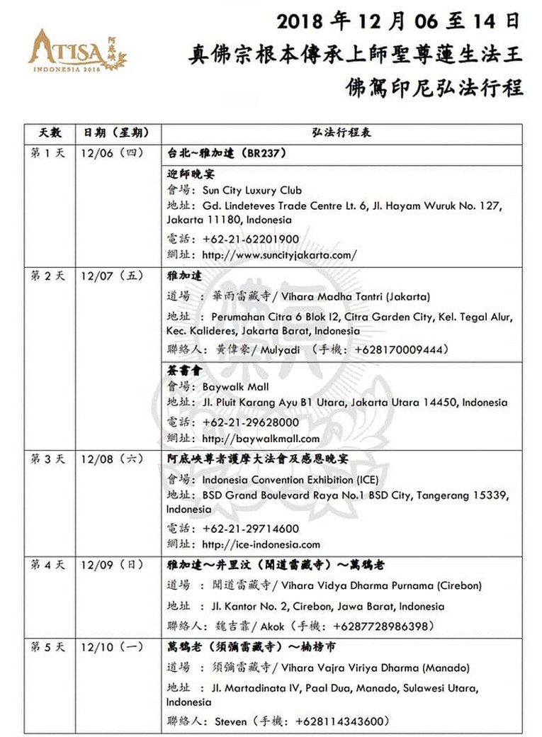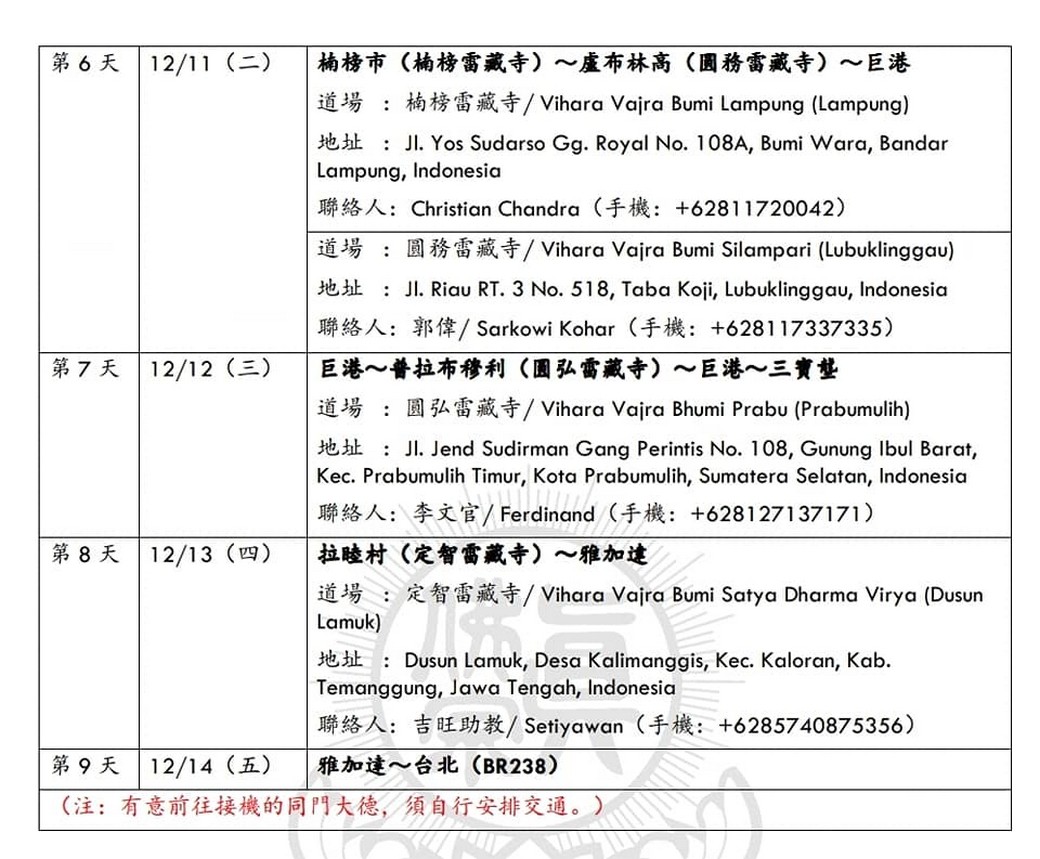 ◎蓮生法王佛駕印尼七座雷藏寺行程如附圖, 詳情參閱: