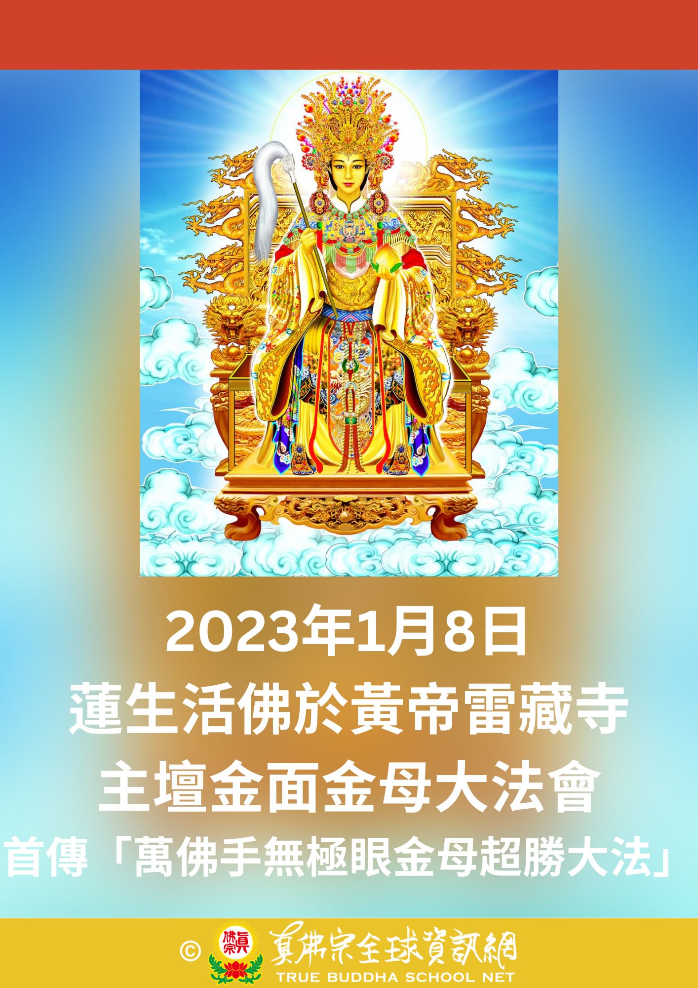感恩根本上師聖尊蓮生活佛傳承大加持,感恩師母蓮香上師安排,於2023年1月8日星期日,師佛親臨黃帝雷藏寺主持「金面金母息災.祈福.超度.迎財神水供大法會」,迎請癸卯兔年北方財神.福神.喜神,並首傳「萬佛手無極眼金母超勝大法」及灌頂,並為龍王神殿開光安座。