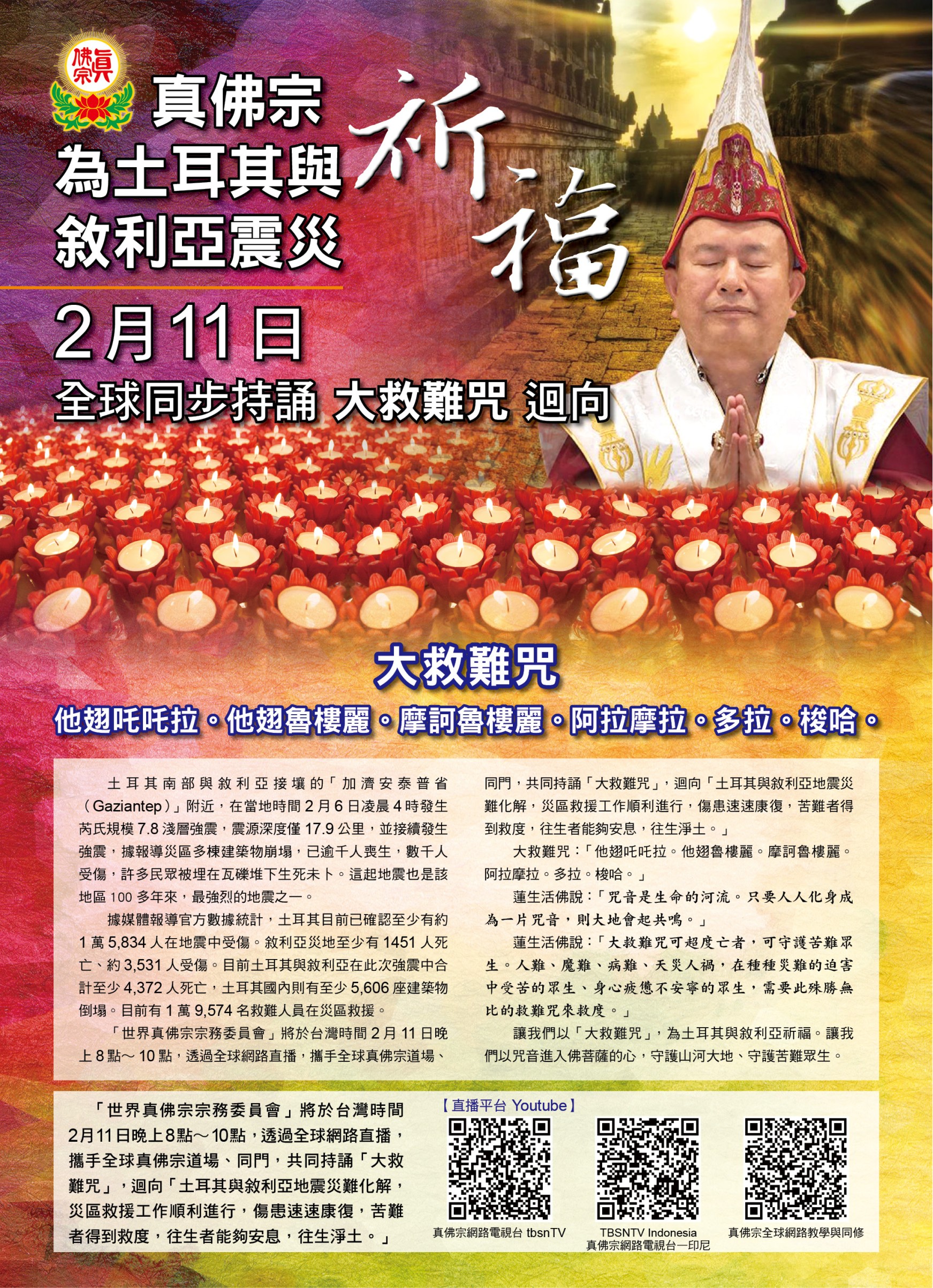 真佛宗為土耳其與敘利亞震災祈福 2月11日 全球同步持誦大救難咒迴向