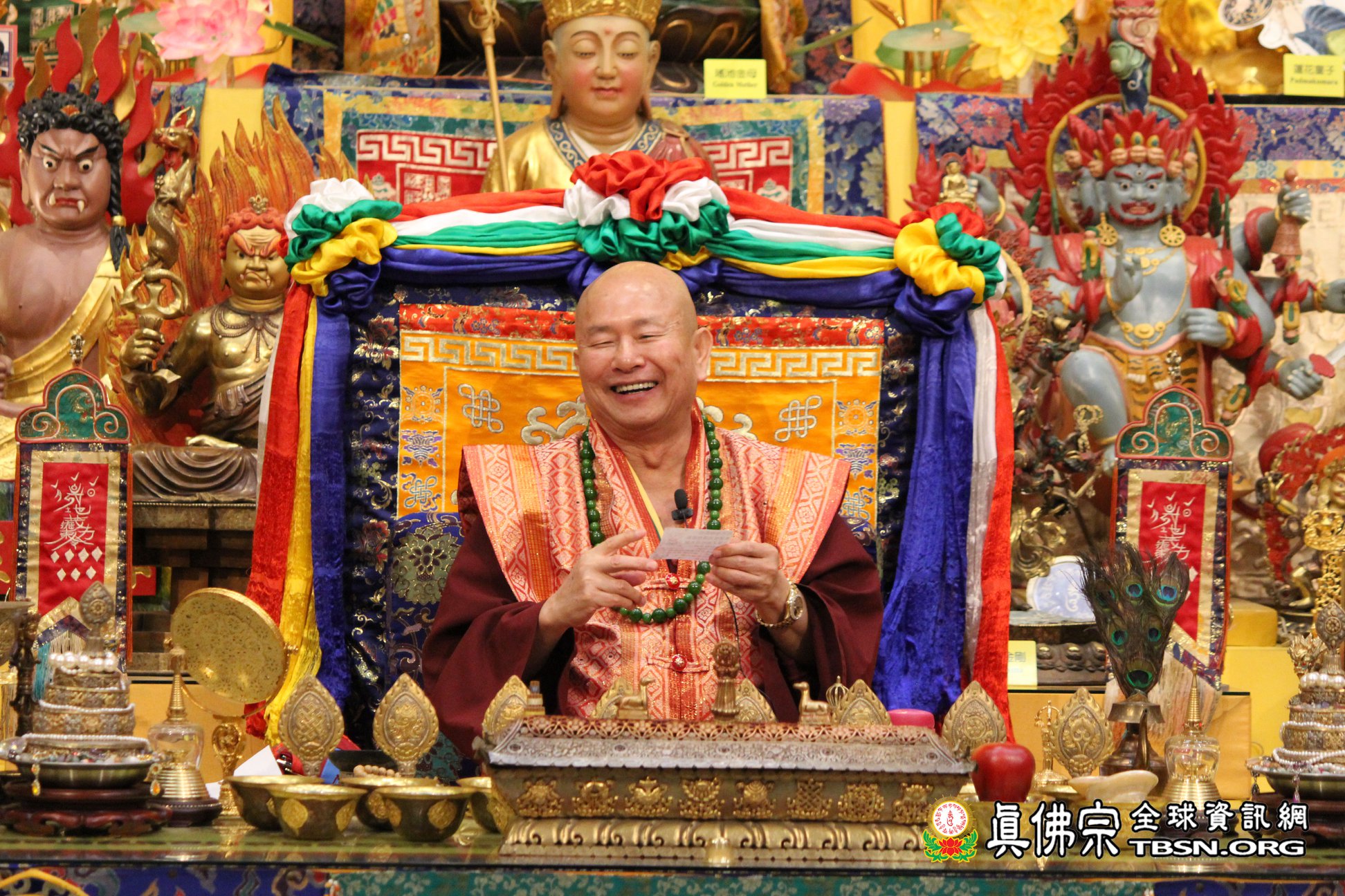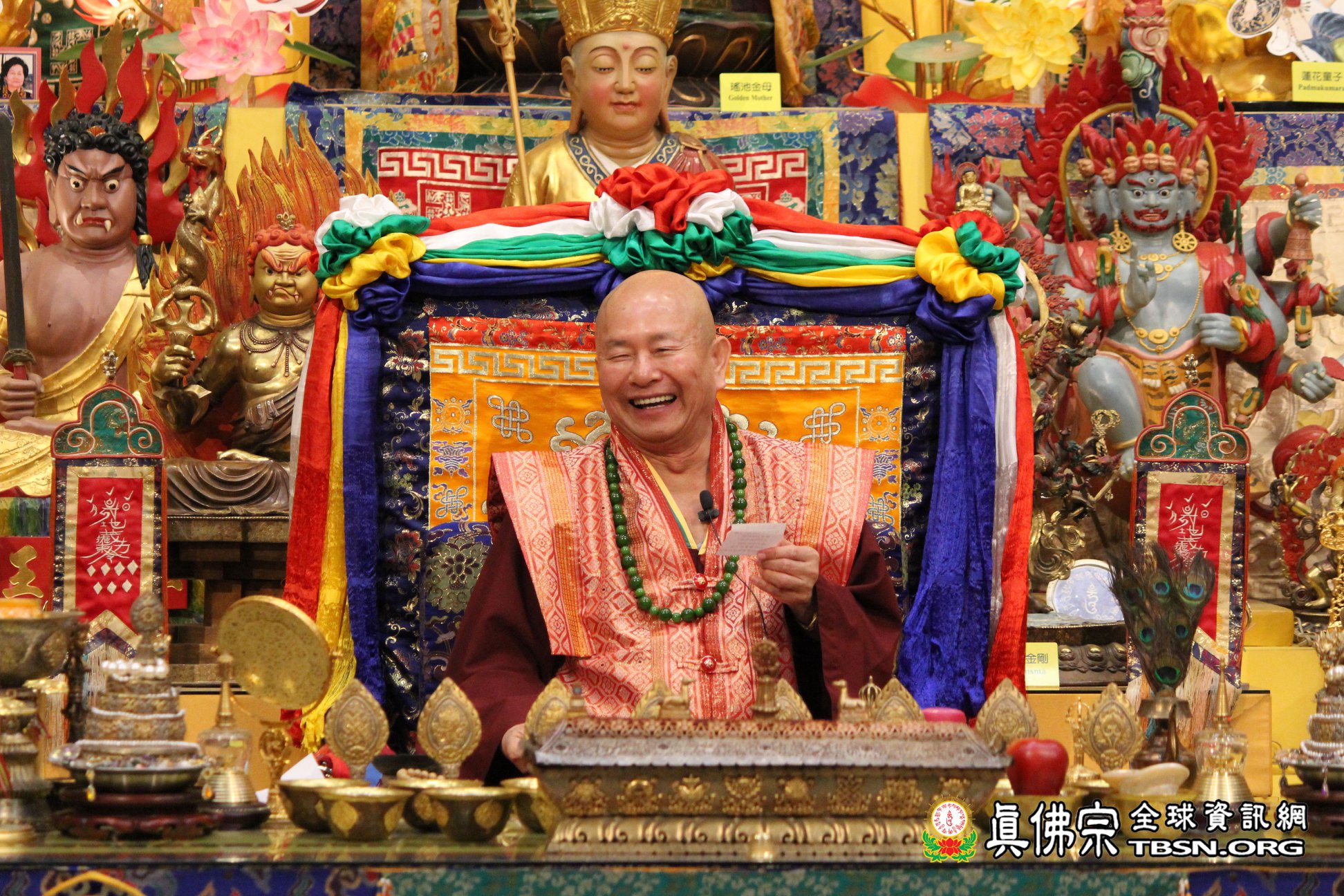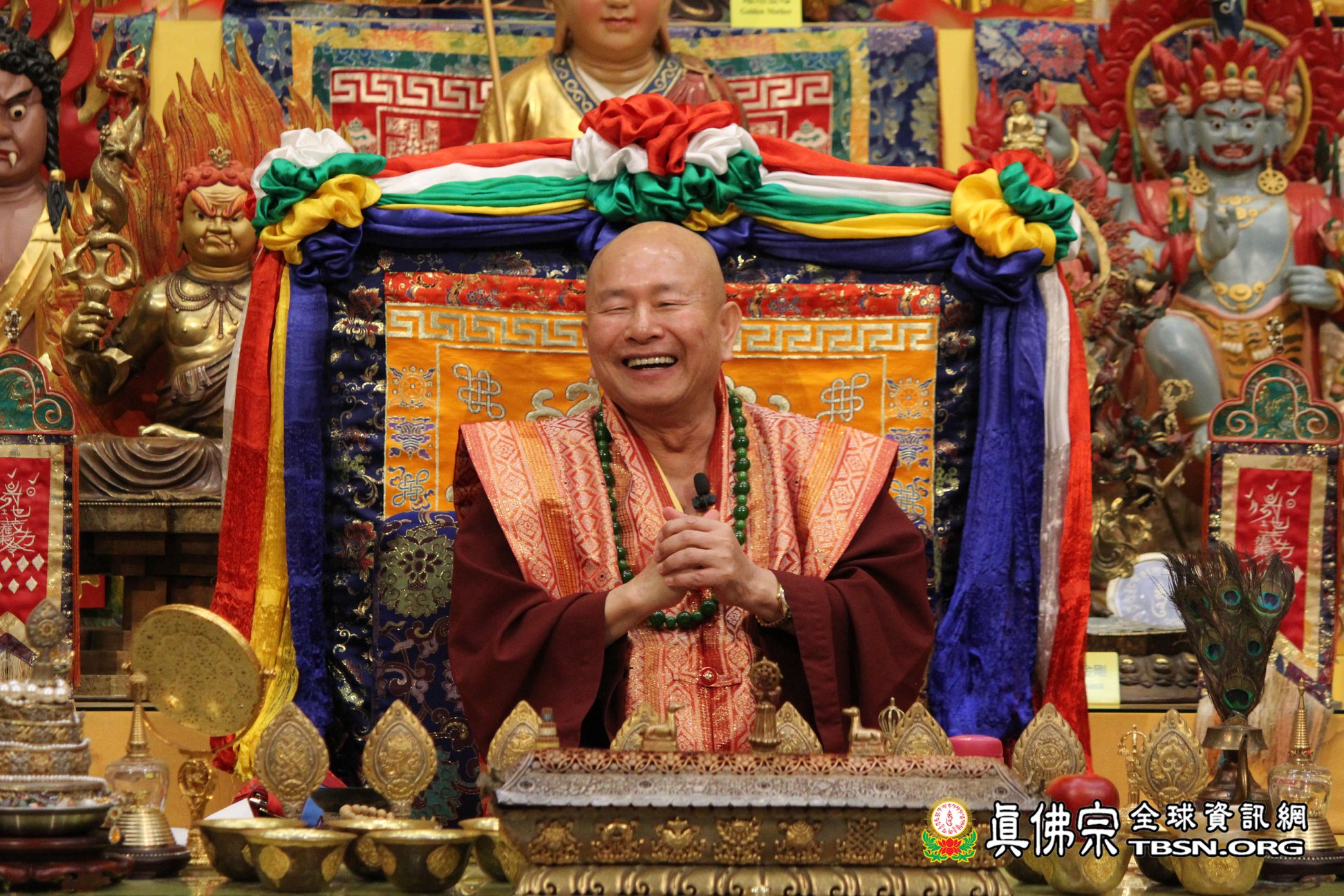 乘著夕陽餘暉,習習的晚風吹拂,師尊、師母共同連袂出席祖廟今晚蓮華生大士本尊法的同修活動。在佛光加持、莊嚴圓滿的修法結束後,聖尊談到同修本尊蓮華生大士在藏地裡,是紅、黃、白、花四個教派都共同尊崇的偉大的菩薩,祂也是最早進入西藏弘法的大成就者。因為祂本身有很大的神通力,把苯波教(黑教)所有的神祇、鬼神降伏,使祂們變成密教的護法,及護持佛教的神。