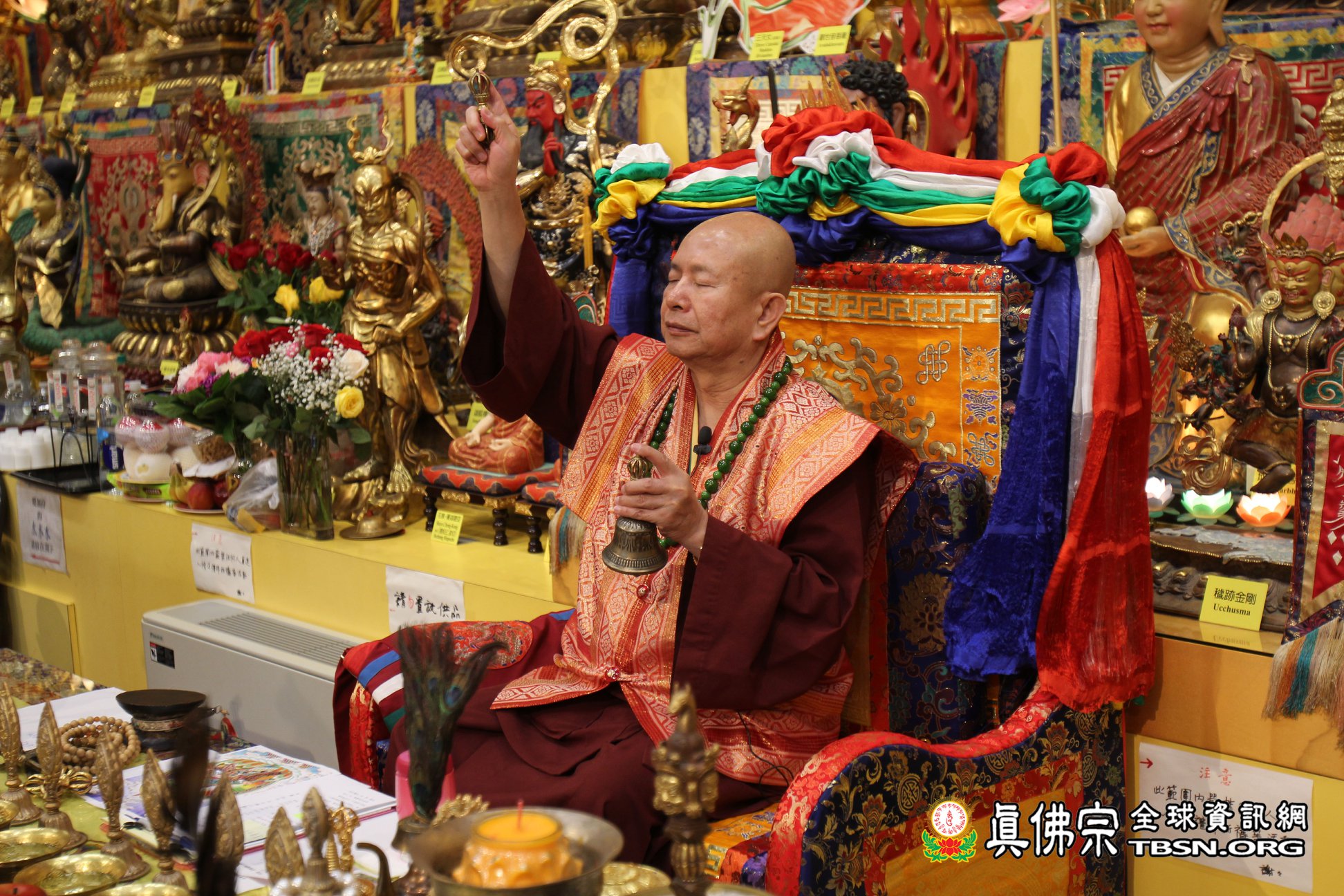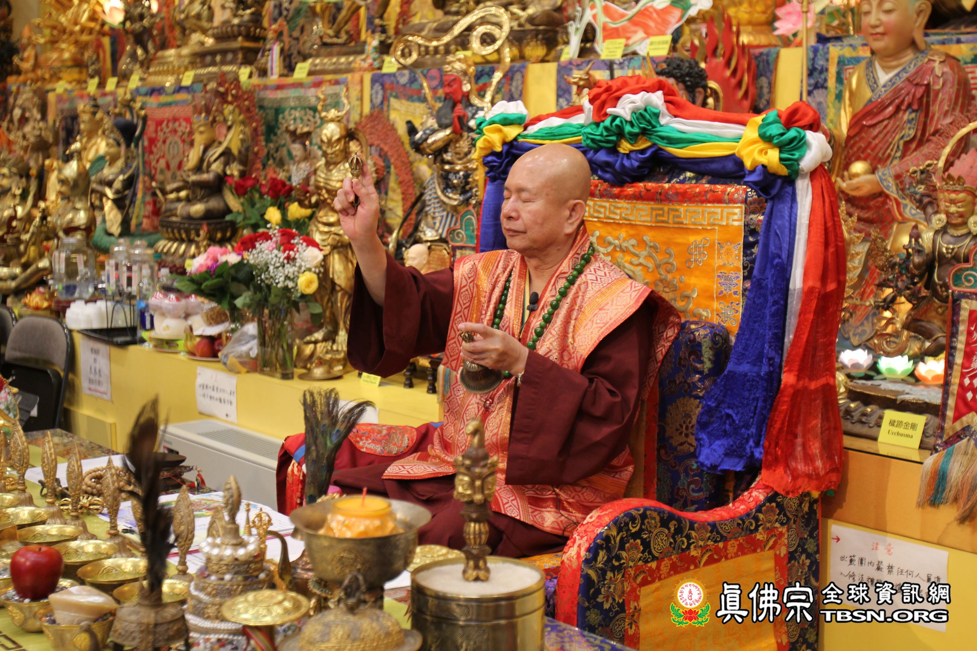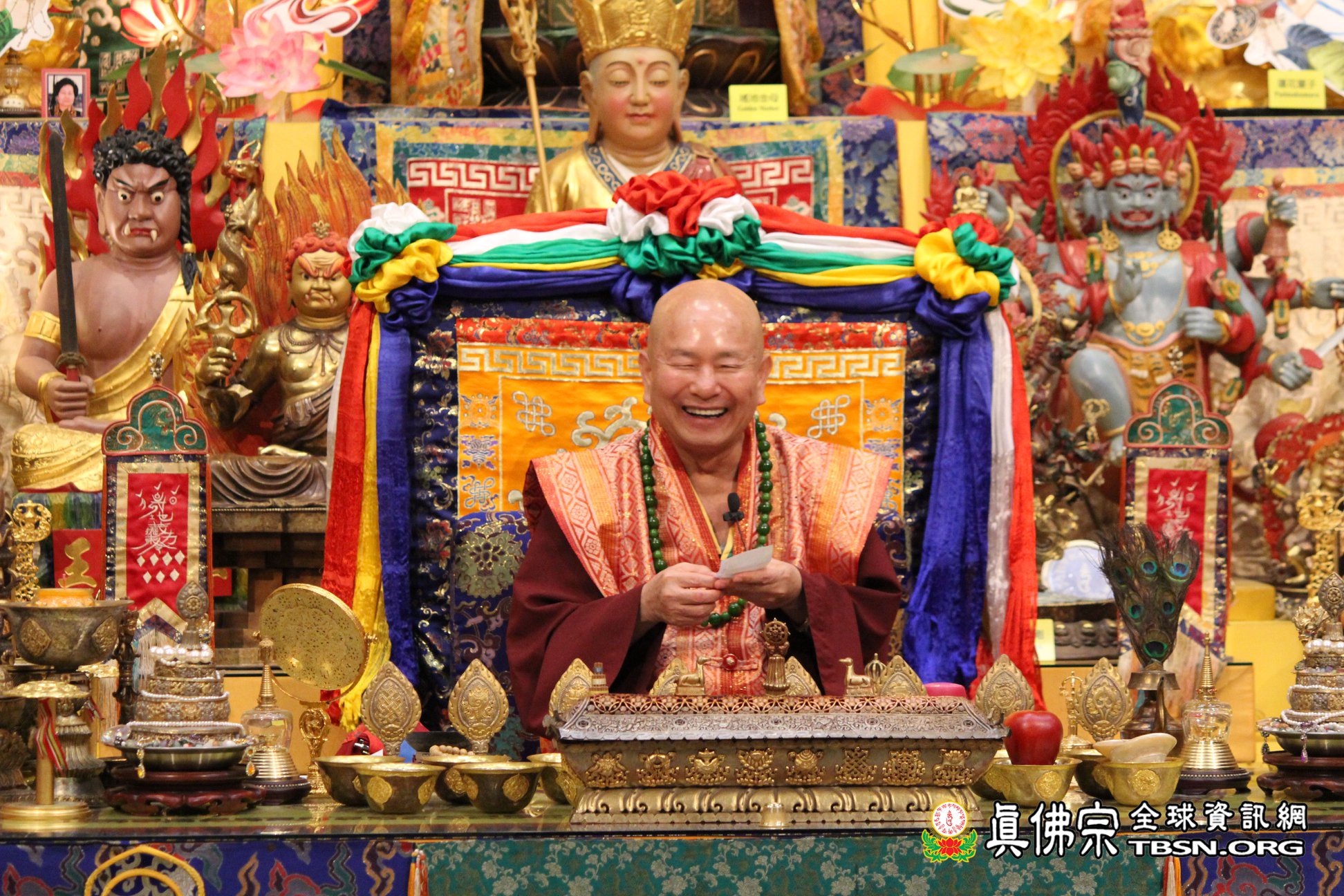 乘著夕陽餘暉,習習的晚風吹拂,師尊、師母共同連袂出席祖廟今晚蓮華生大士本尊法的同修活動。在佛光加持、莊嚴圓滿的修法結束後,聖尊談到同修本尊蓮華生大士在藏地裡,是紅、黃、白、花四個教派都共同尊崇的偉大的菩薩,祂也是最早進入西藏弘法的大成就者。因為祂本身有很大的神通力,把苯波教(黑教)所有的神祇、鬼神降伏,使祂們變成密教的護法,及護持佛教的神。