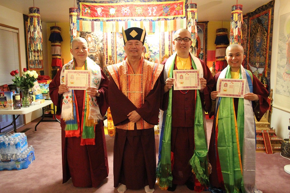 聖尊蓮生活佛首先隆重地召請五方佛及壇城諸尊,依序為三人賜授金剛杵、金剛鈴、寶瓶、舍利塔及五佛寶冠等灌頂,並給每位加持,隨後新上師們一一向聖尊敬獻哈達及供養,最後根本上師聖尊蓮生活佛與三位出家上師一起合影留念,莊嚴的灌頂典禮圓滿吉祥!