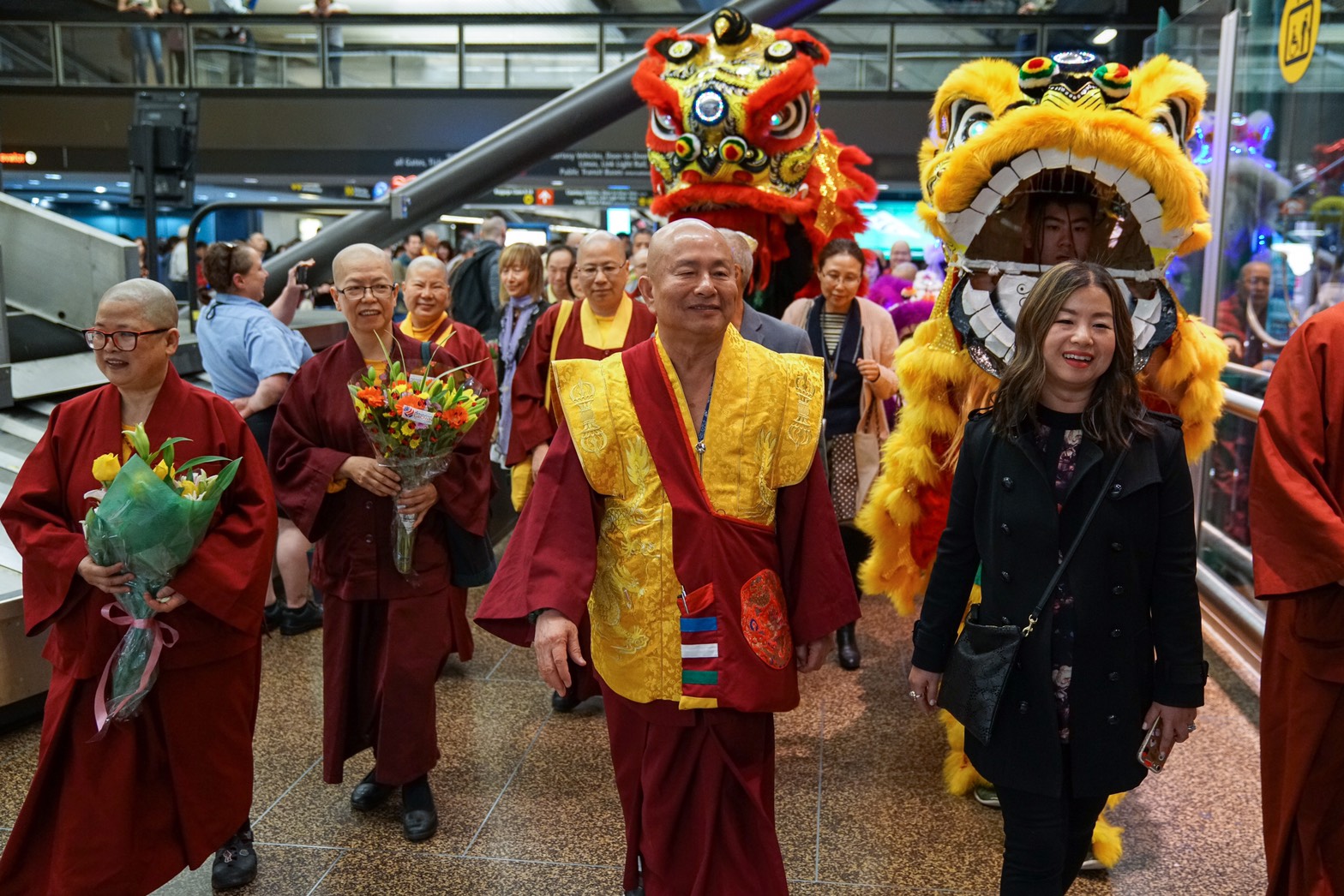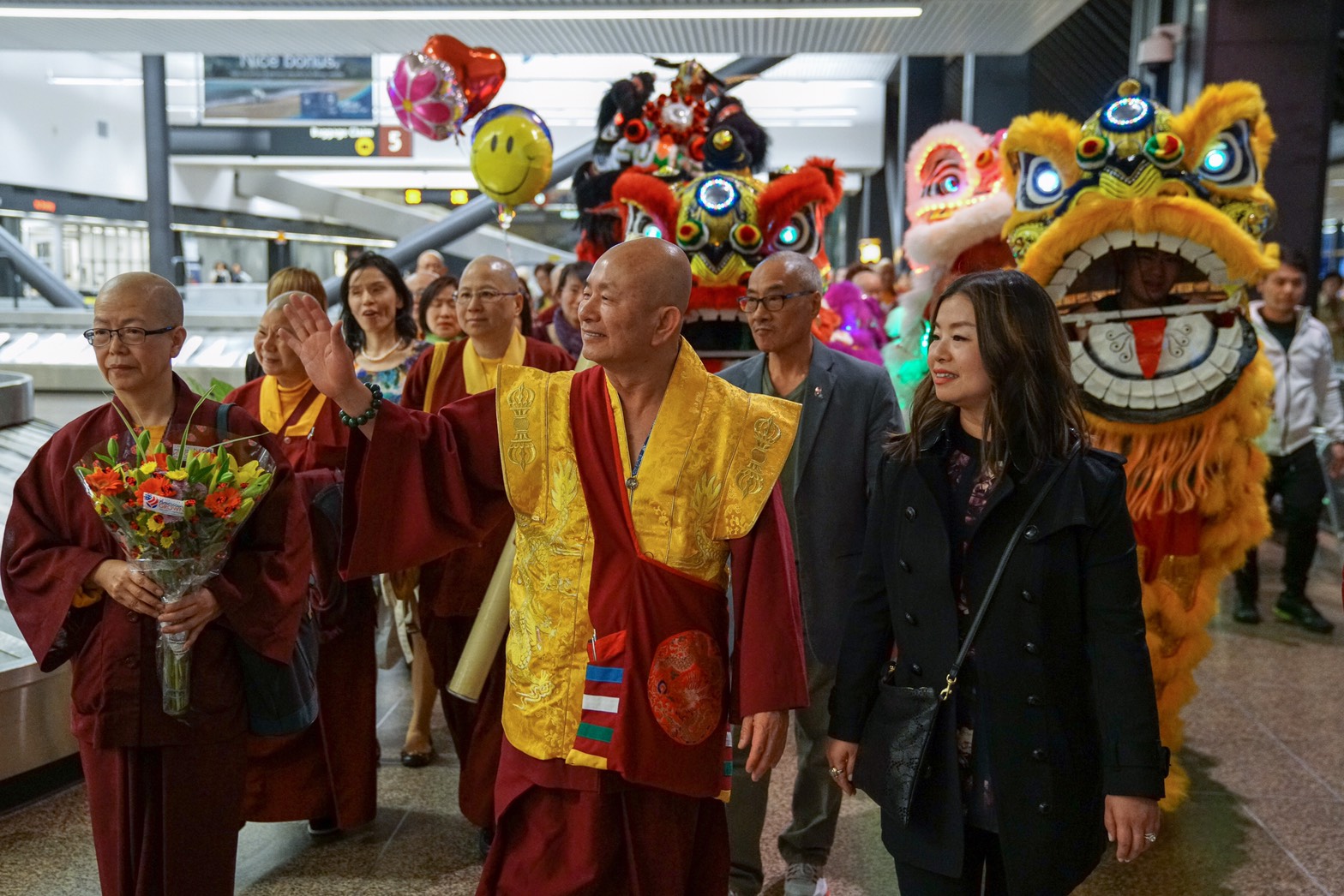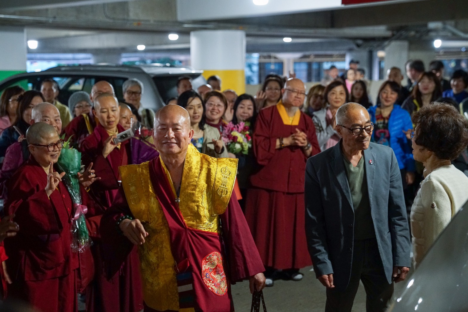 當聖尊蓮生活佛 盧勝彥暨師母蓮香金剛上師的身影在手扶梯的一端出現時,與會所有人歡欣鼓舞,歡迎布條映入眼簾,現場搭配著舞龍舞獅在在的顯示美加弟子的思念與期盼!在思念的笑容與淚水互相輝映交織下。