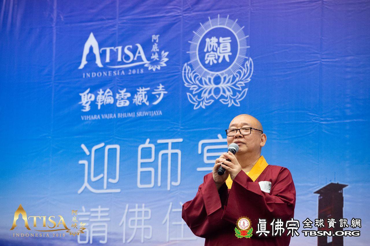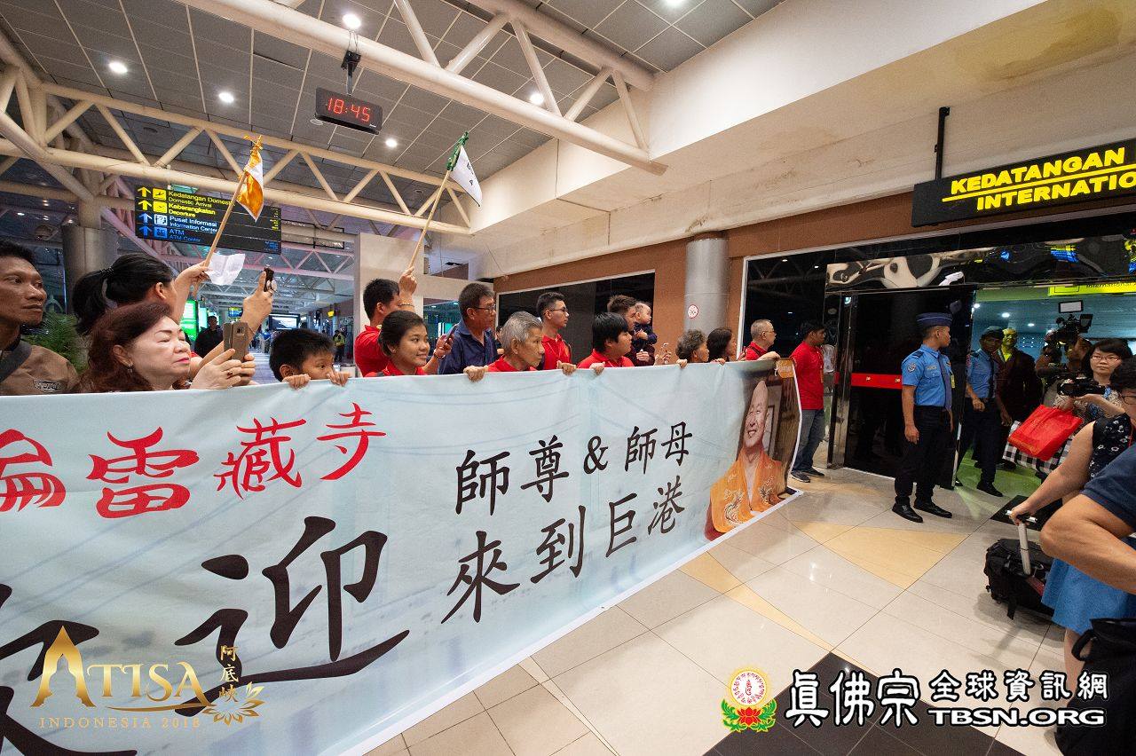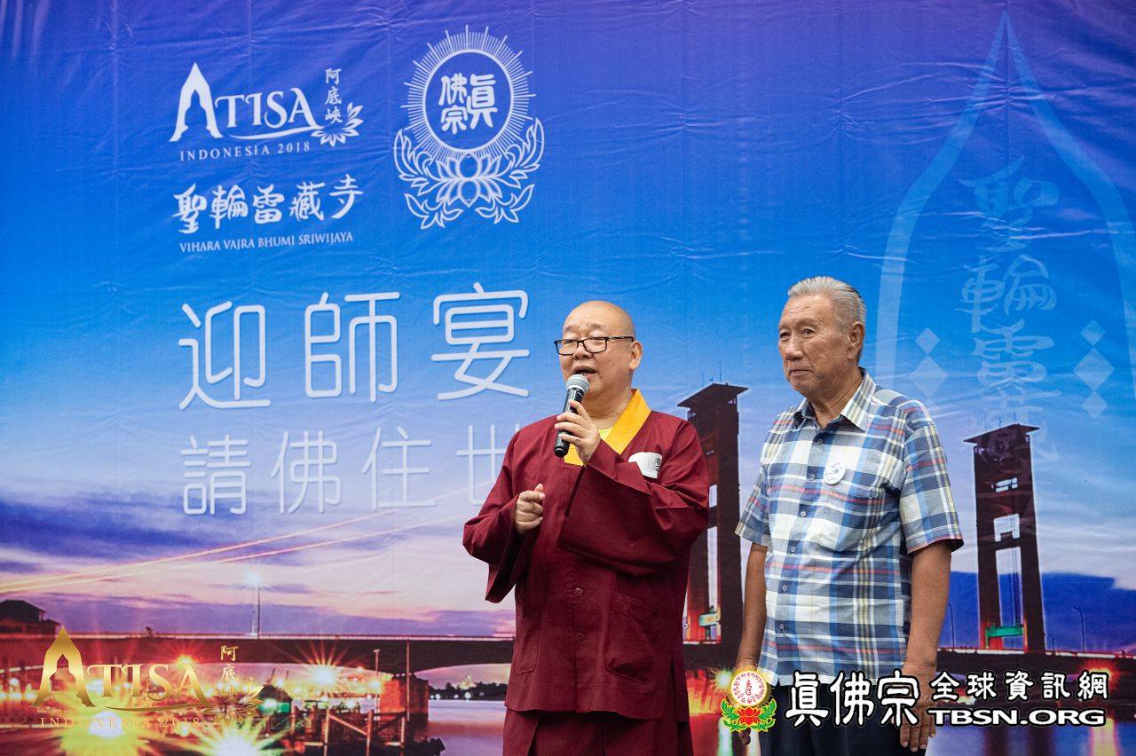 2018年12月11日印尼巨港聖輪雷藏寺迎師宴 【TBSN報導】 2018年12月11日,聖尊一行人抵達印尼巨港。在機場,有聖華堂及聖輪雷藏寺同門來迎師。當晚聖輪雷藏寺設宴歡迎聖尊。除了傳統歌舞,有兩位師姐獻唱了《感恩師尊》及《You Raise me up》,歌聲嘹亮動聽。 聖輪雷藏寺致詞感恩師尊到來印尼傳下阿底峽尊者法,也感謝主辦單位特別安排此行程,讓聖輪雷藏寺也有機會供養聖尊。 聖尊亦以虎虎生威的金剛棍加持弟子們,晚宴在愉悅的氣氛中結束。