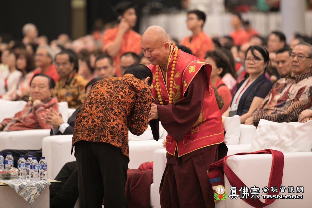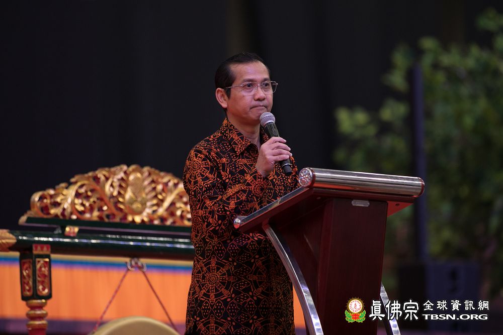 致詞說歡迎及感恩蓮生法王蒞臨印尼弘法。法王也贈送紀念品于貴賓們。