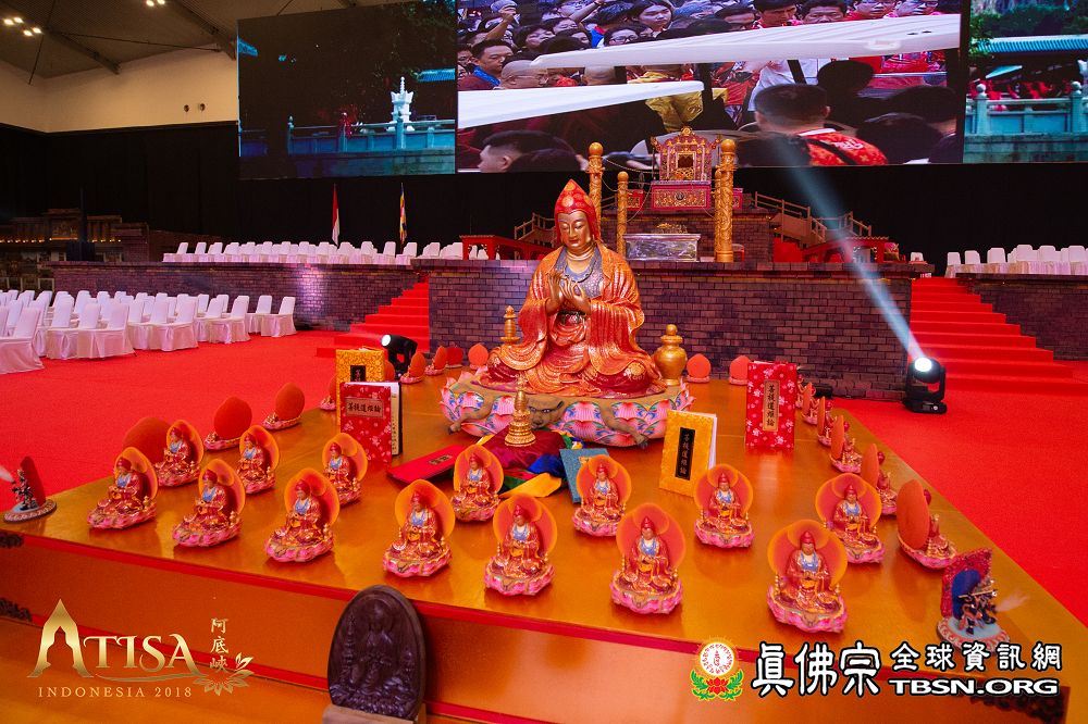 法王首先為真佛傳承噶當佛塔開光加持及為同門做總加持,接著為主壇城開光加持,並試法座和測試音響。除了唸了各種本尊咒,還唸了一段高王觀世音真經。大法會主壇城恍如占碑佛塔豎立在前,那是阿底峽尊者拜金洲大師為師,種下菩提樹的地方,也就是千年後蓮生法王種下菩提樹的地方,此情此景,令人感受到時空交錯的奇妙。壇城邊有一堵牆,印滿全印尼的雷藏寺的照片。
