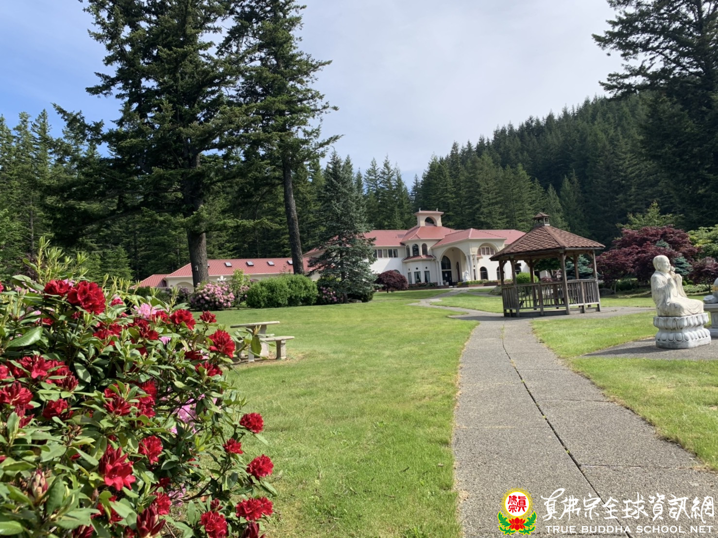 三月下旬至今,疫期已過兩個月,華州政府的「居家禁足令」遲遲未能解禁。彩虹雷藏寺護摩殿外的停車場空曠無人,原本接待來賓的座椅,卻已佈滿一層灰塵。象徵獅王菩薩的一對北石獅,無視來賓訪客多寡,仍忠誠的鎮守在山莊的鐵門入口,哪兒也不去,持續發揮守護山門的威力。入口兩旁的粉紅花與白花皆已盛開,隨風擺動,一隻隻勤懇工作的蜜蜂,在花叢忽上忽下,為了採花蜜忙碌不停,似乎也沒感覺人類世界的改變。