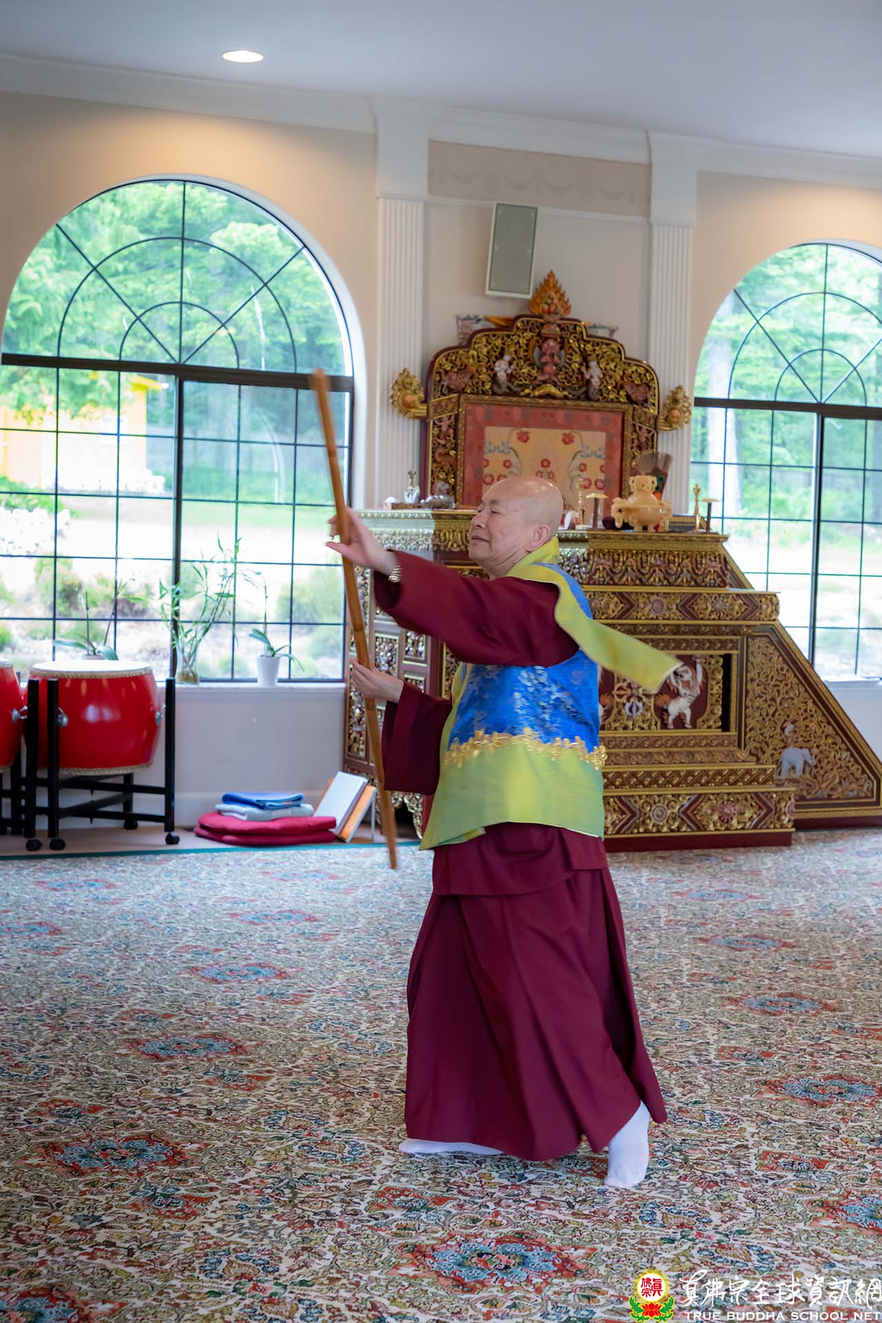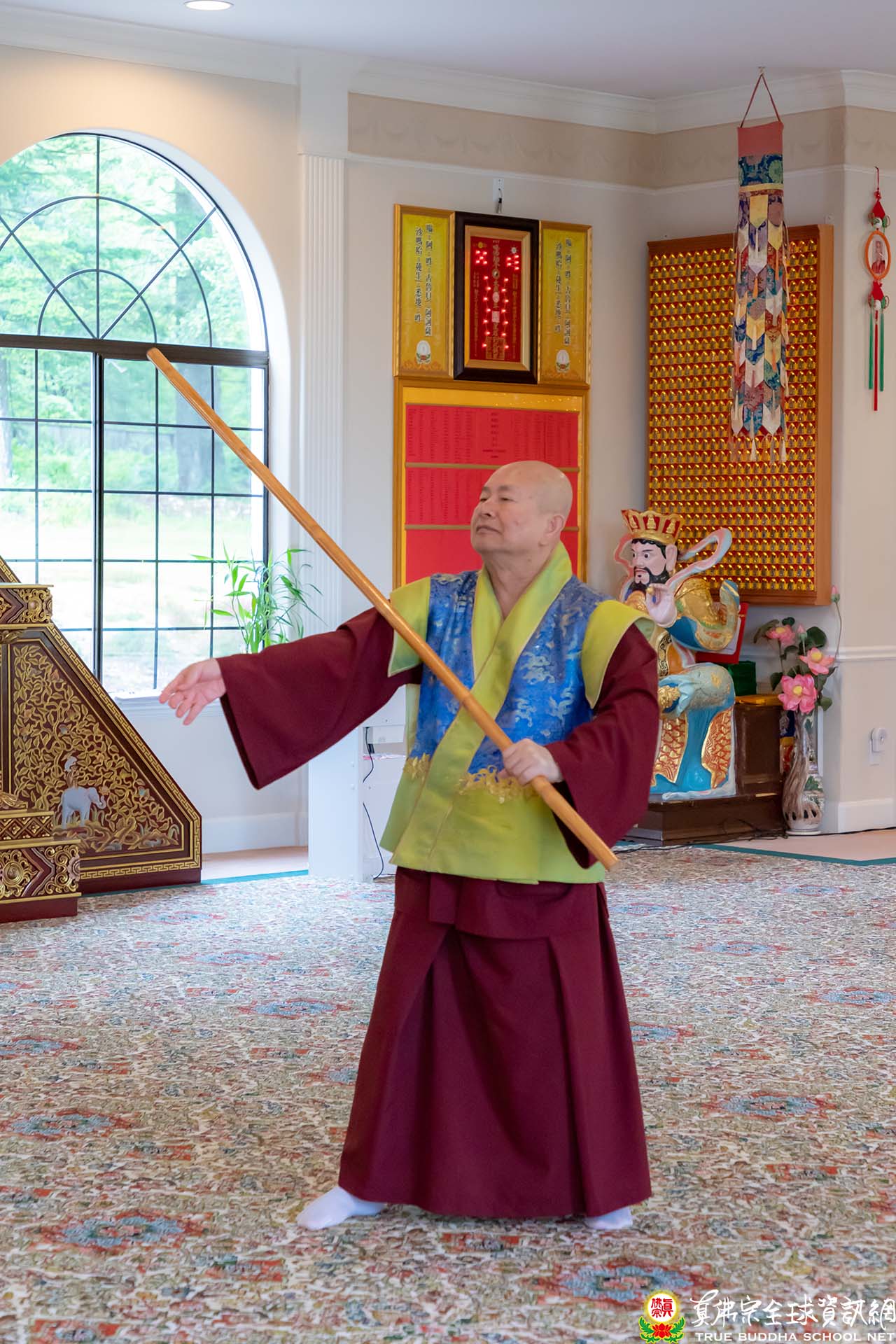 大殿的表演節目雖然不多,但各個卯足了勁,以呈現最好的表現給師尊師母觀賞。一位常住上師演唱一首《青藏高原》,不但高音飆上去,最後餘音迴旋不絕,中氣十足,博得師尊師母的喝采。一位協助直播的師姐表演現代舞蹈,曲名《Dancing With Your Ghost;譯:舞魅》,一身黑色纖細的短裙舞衣,婀娜多姿,體輕如風,舞姿曼妙如蝴蝶般飛舞,令人驚艷,也一樣贏得熱烈掌聲。而師尊壓軸的金剛棍,以精湛的功夫,技驚四座,獲得全場人員的歡呼聲。休息時間,師尊詢問該師姐如何學習舞蹈,得知原來師姐是看影片自練自學,真是不簡單。師尊聽到舞魅的曲名,馬上連想到一種舞風叫做「靈魂舞Soul Dance」,是起源於60、70年代,當時黑人的音樂及舞蹈上常用靈魂Soul一詞來表達他們的情緒。師尊說,許多原住民,天生都是擅長歌舞。而眾所皆知,師尊年輕時,也是舞林高手,對各種舞步的拍子和節奏,都能駕輕就熟。對師尊各方面學識廣博,大家都深感欽佩,師尊只淡淡說:「密教行者尤其是為師的,要甚麼都懂,要有足夠的歷練,千錘百鍊而不退,能不動心,才能經的起考驗。」