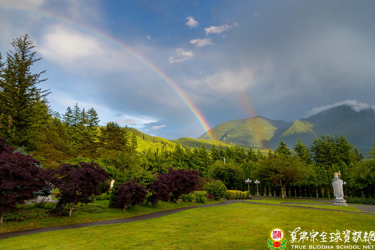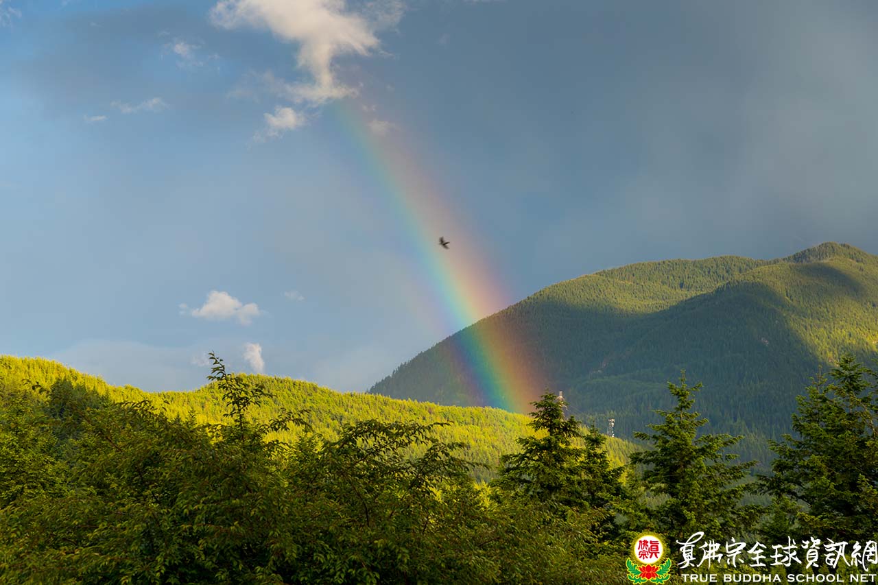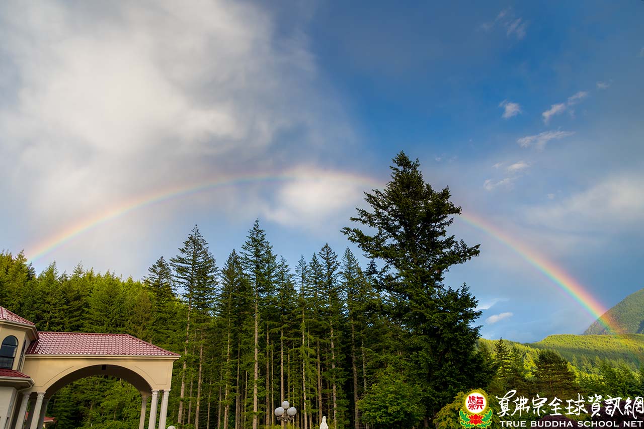當師尊師母座車離開時,天空不知何時升起了明媚的雙彩虹,當作吉祥的歡送禮,真是名符其實的彩虹雷藏寺!遠望群山連綿不絕,近看芳草青碧,翠林如海;靈秀的山莊,山嵐搖舞,四季如詩,單單今天一日數度換裝,豐富多彩,變幻莫測。再會吧,夢幻般的彩虹,讓我們揮揮手下周再見。