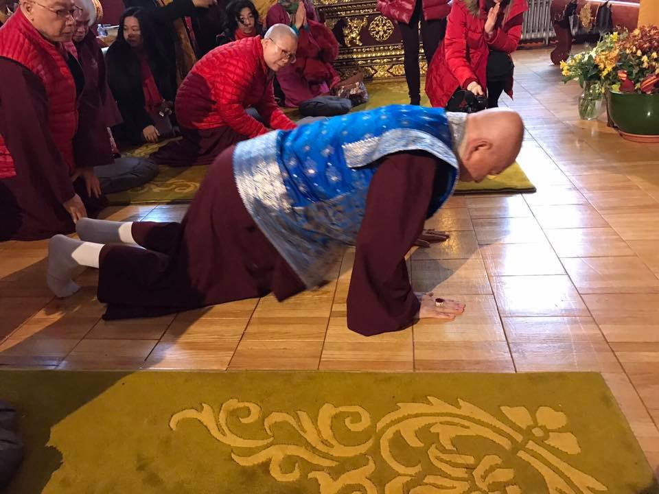 蓮生活佛步入薩迦寺後,隨即向著壇城佛菩薩護法諸尊,做藏密式全身投地大禮拜。