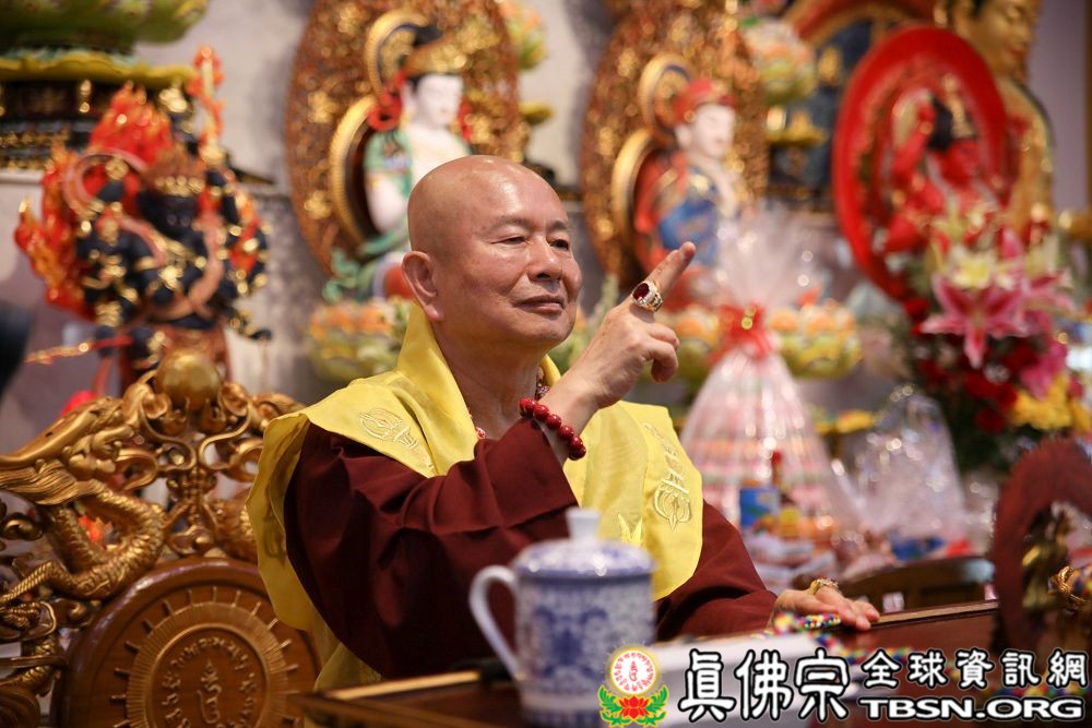 聖尊應邀開示:今天早上自己在飯店,由於窗簾沒有關,致令自己被晨陽照了整個早上,曬成了印尼人的臉,這句話令印尼同門聽了都笑開懷。聖尊覺得華雨雷藏寺十分莊嚴,每尊佛菩薩像都雕刻得很精美,他覺得道場靈氣非常重。此外,聖尊覺得這次大家都非常團結,真是殊勝。