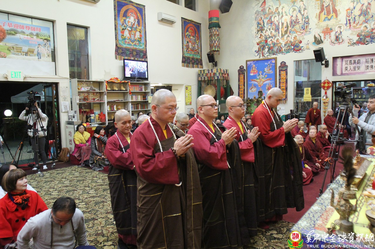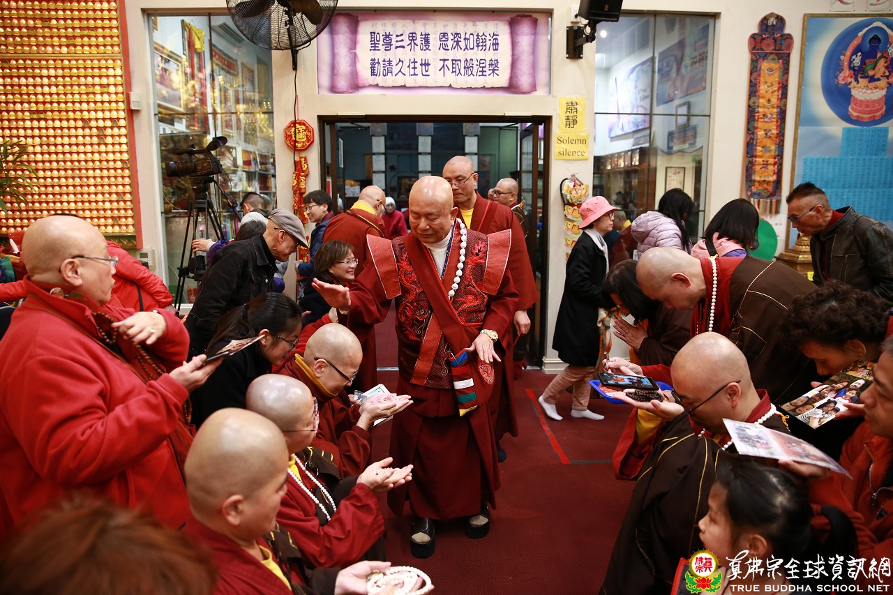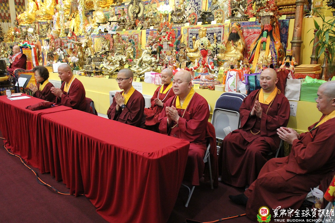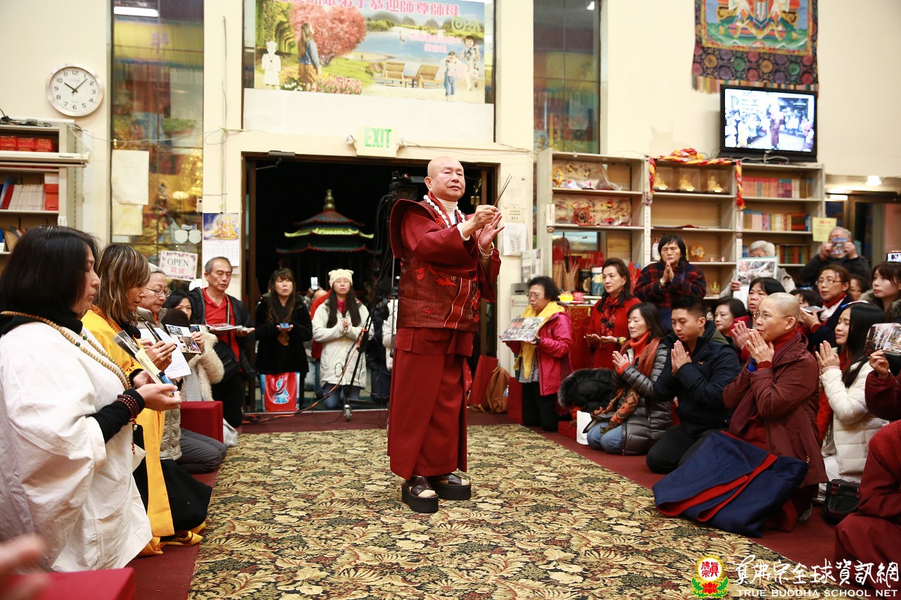 天氣雖然非常寒冷,但弟子們護持聖尊、虔心求法的熱情不減,許多同門仍從世界各地遠來祖廟朝聖。今晚西雅圖雷藏寺的同修主尊是阿彌陀佛。在同修開始前,首先舉行了西雅圖雷藏寺第三十五屆法師研習班結業儀式,本次法師研習班的學員是蓮誰法師、蓮璃法師、蓮唔法師、蓮梁法師、蓮闐法師、蓮卿法師、蓮褐法師、蓮遠法師、蓮唯法師,共九位出家法師,由聖尊頒發結業證書,並且與聖尊合影留念。在眾人的見證之下,隆重的結業儀式禮成,恭喜每一位完成法師研習班的學員,將來都能秉持聖尊的教導,自利利他、自度度他。