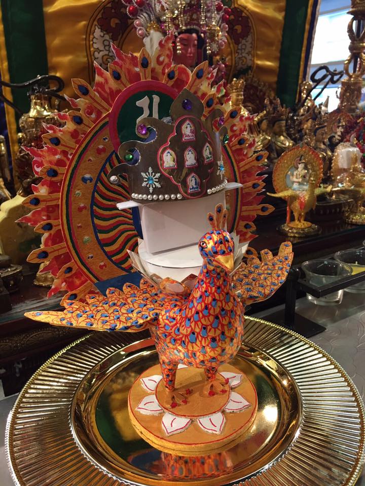 釋迦牟尼佛在過去世曾有一世當過孔雀王,所以孔雀明王是釋迦牟尼佛本身的受用身。孔雀明王是阿彌陀佛的變化身,【阿彌陀經】裡面提到西方極樂世界有「共命 之鳥」,有孔雀、鸚鵡、迦陵頻迦,其中的孔雀,就是阿彌陀佛的變化身。孔雀明王戴大日如來冠,也就是毘盧遮那佛的等流身。根源來自於三個佛,很偉大。
