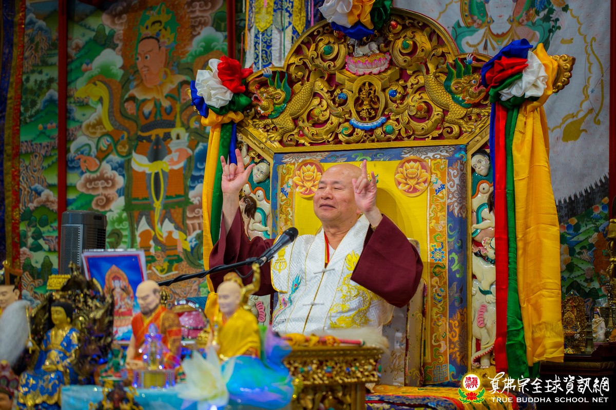 護摩法會進行時,師尊與諸尊合一,演化手印,力量非常強,看不出手臂有任何不適,工作人員也鬆了一口氣。法會後,工作人員準備的供佛表演節目,有堪稱歌王、歌后級的三大卡司,賣力獻唱國語和台語歌曲;一位協助直播的師姐,演唱一首青春洋溢的西洋歌曲,以及一位廟常住唱出曲調高亢悠揚的蒙古語歌曲,反映當地的風土人情;另一位年輕工作人員則大跳韓國美少女熱舞,讓現場熱情上升好幾度。每一位都有近專業水平的演出,皆博得師尊師母大大讚賞。終於等到師尊給大眾加持的壓軸戲,為了讓師尊的手多一些休息,師尊今天不舞拳棍,改開金口唱誦加持大家。熟悉的歌曲,一首接一首,「七朵蓮花」、「荷塘月色」、「陽光和小雨」…... ,每一首都是精彩絕倫,令全場歡呼不斷;師尊動人的歌聲,觸動弟子們的心弦,大家也跟著伴唱起來,師唱徒隨,唱出內心有情有義的天地。