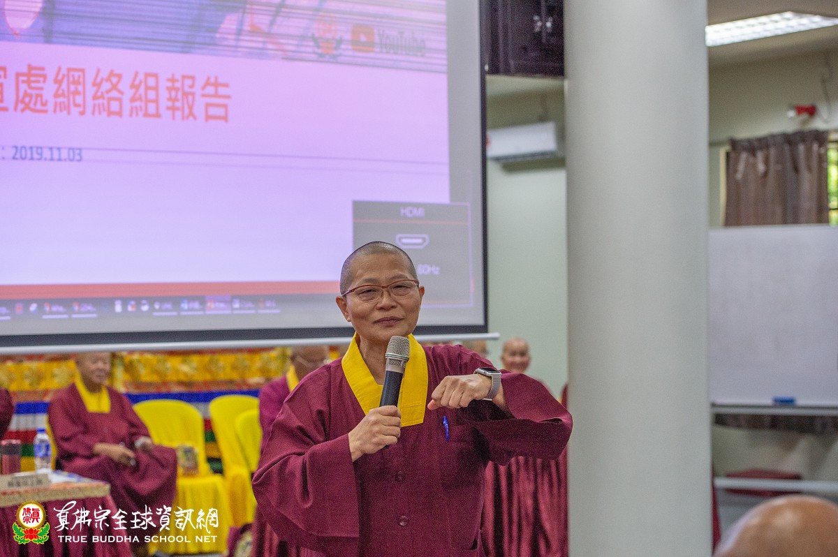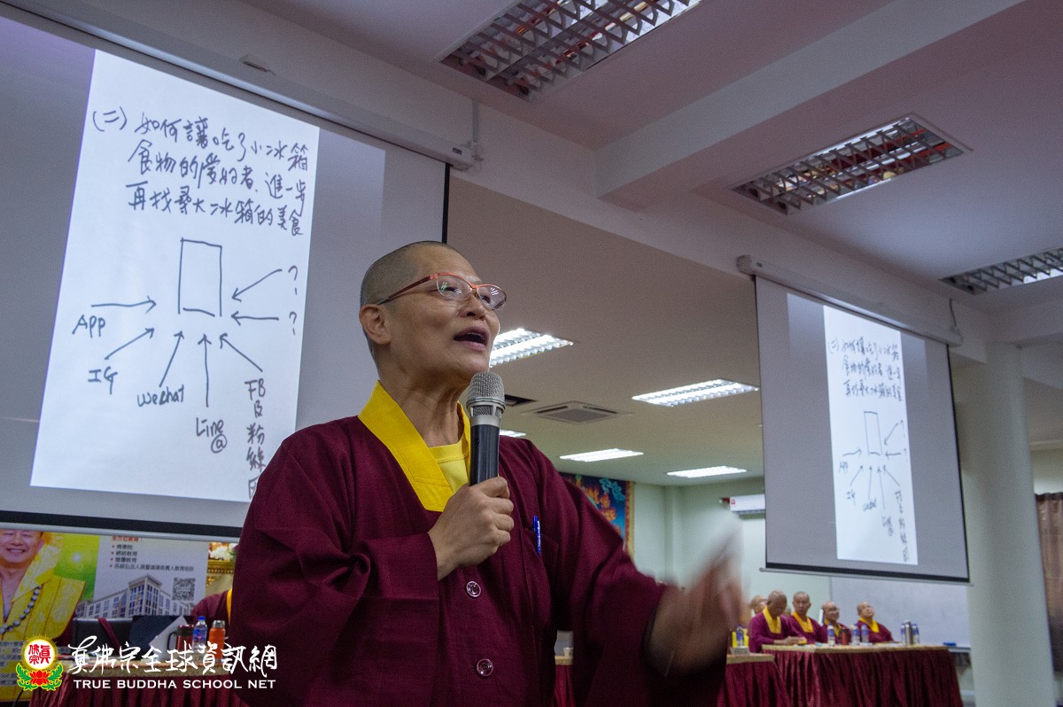 上師表示,剛剛看了蓮僧上師的弘法人員與道場註冊系統,登記的道場只有15‰,講師33‰,助教21‰,法師44%。我們要呼喚我們的家人回來,我們要關懷他們。很多法師,譬如翠微法師,從出家到老化,經過養老院的照顧,還有靈骨塔。如果沒有向心力,如何讓真佛密法能夠繼續飛下去?你要符合雷藏寺的規則、宗委會規格,師尊都是交給宗委會負責,在組織上就要依照章程,如果犯規,不管是誰都會被制裁。