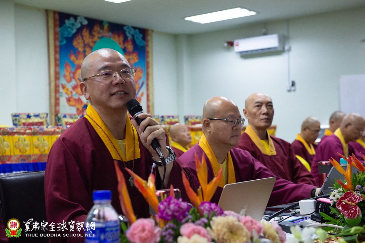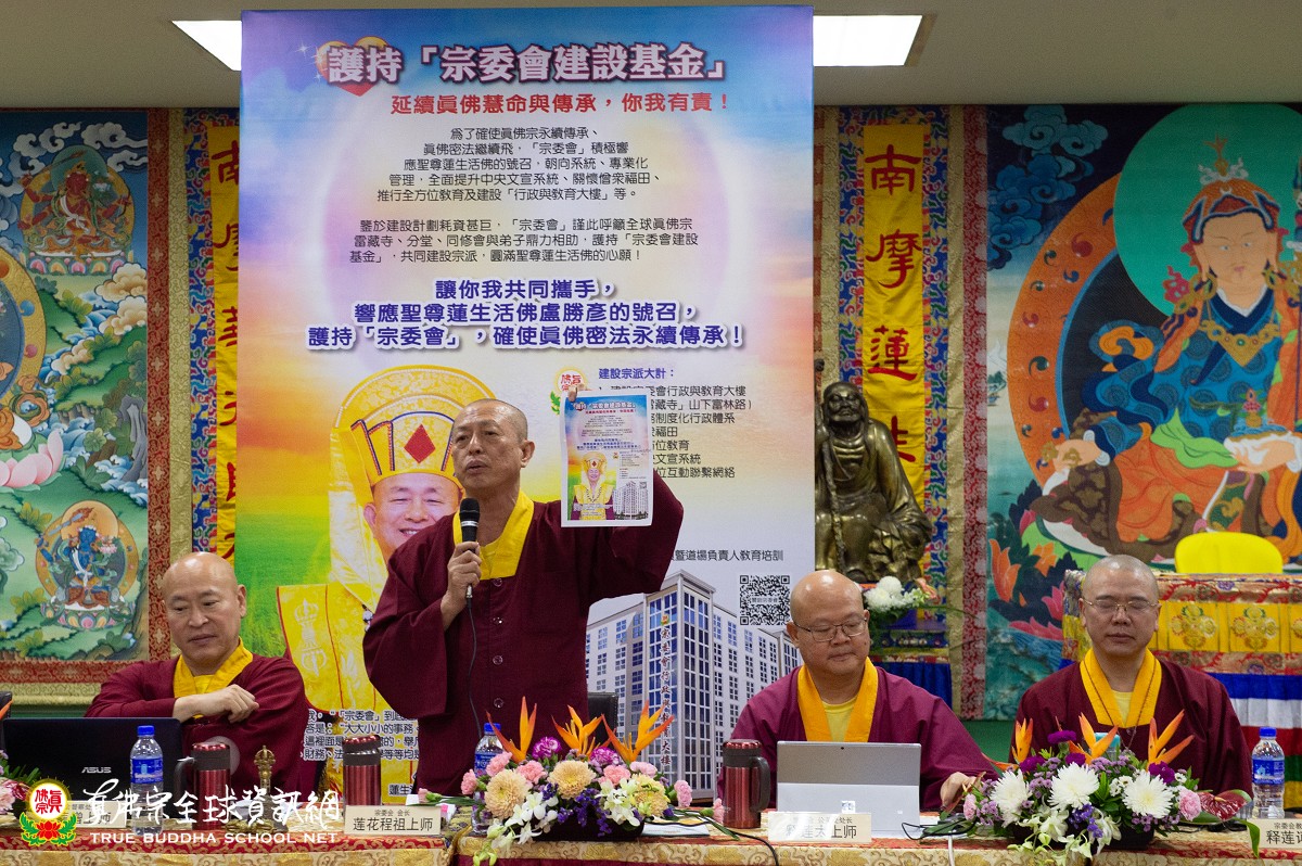 上師期望這些話可以觸動每個人的心。另外,蓮僧上師要蓋西雅圖行政中心。上師期望往後鼓勵所有宗派的各級弘法人員一定要來,要實修實證。他也特別感恩處長們,往往半夜也一起開會、不分日夜的開會,宗委會與在座大家是一體的,宗派一定可以永續傳承下去。